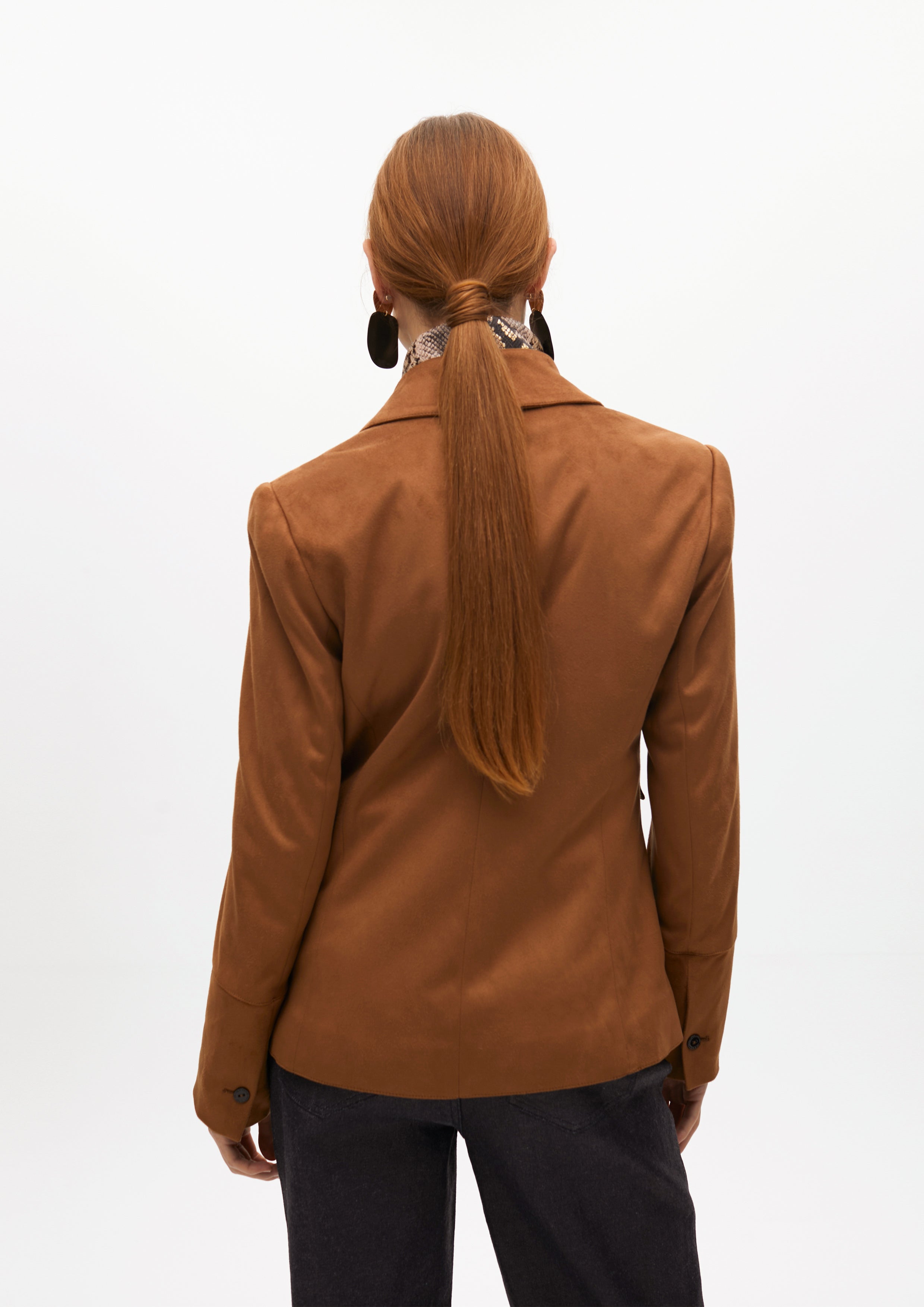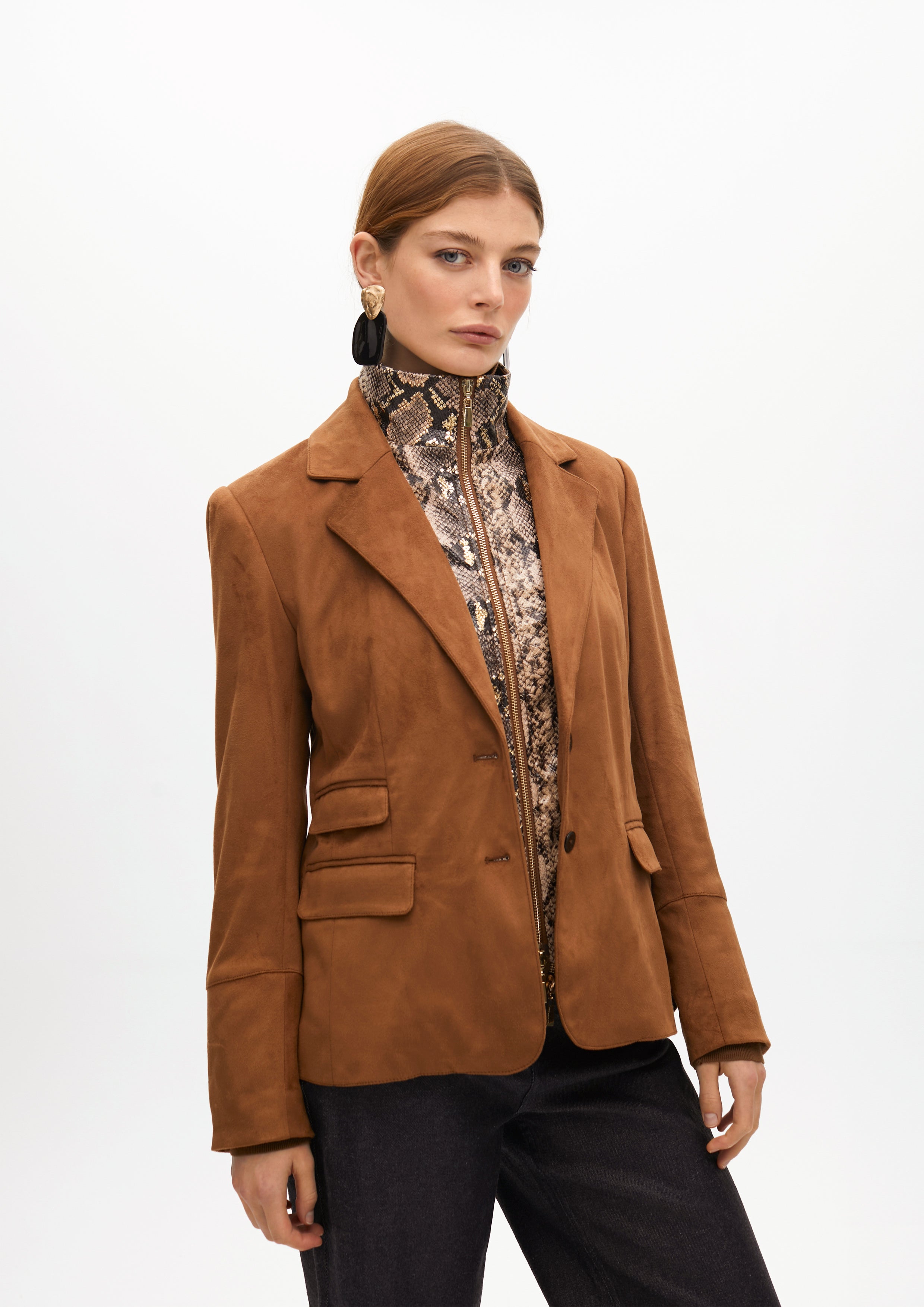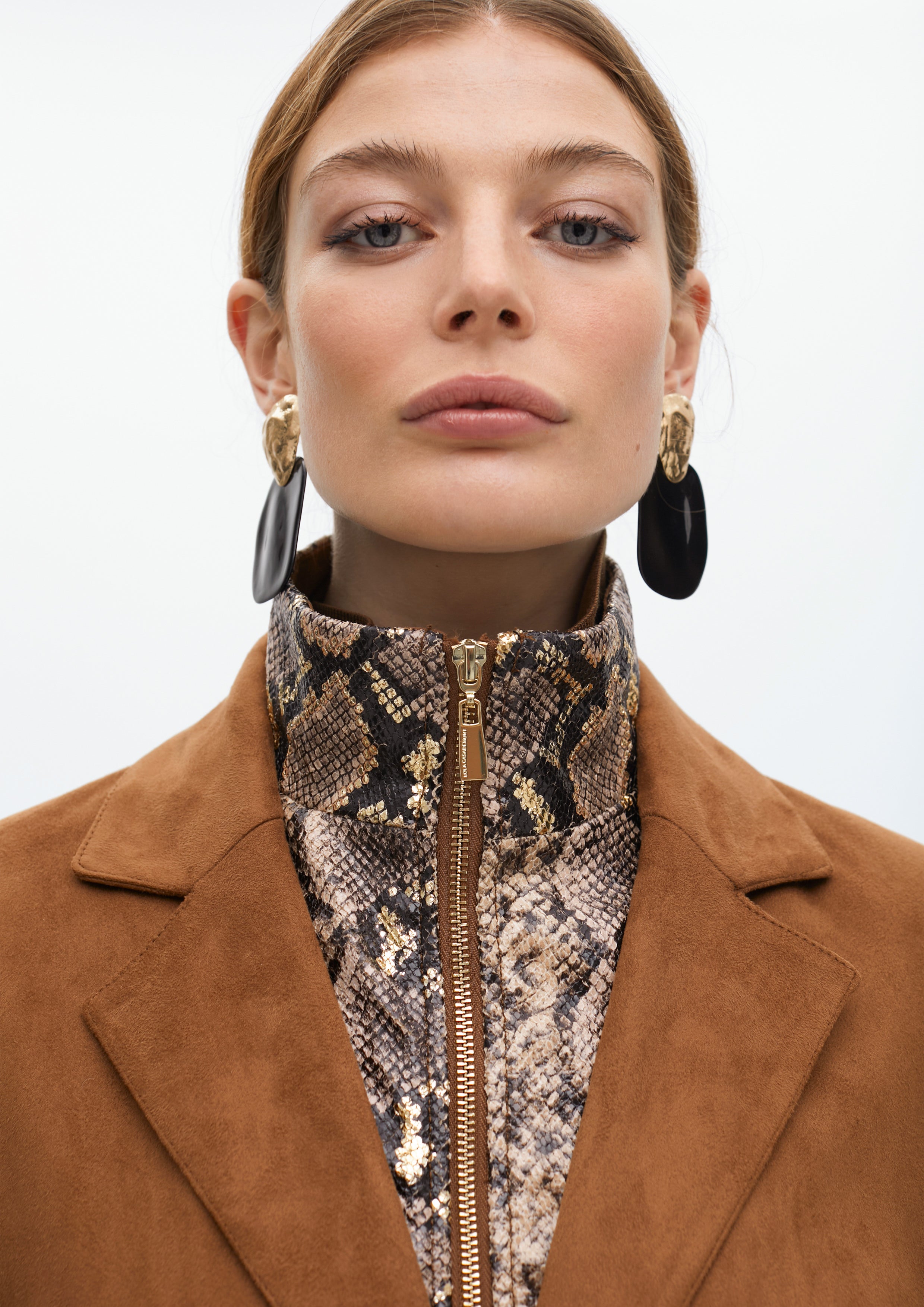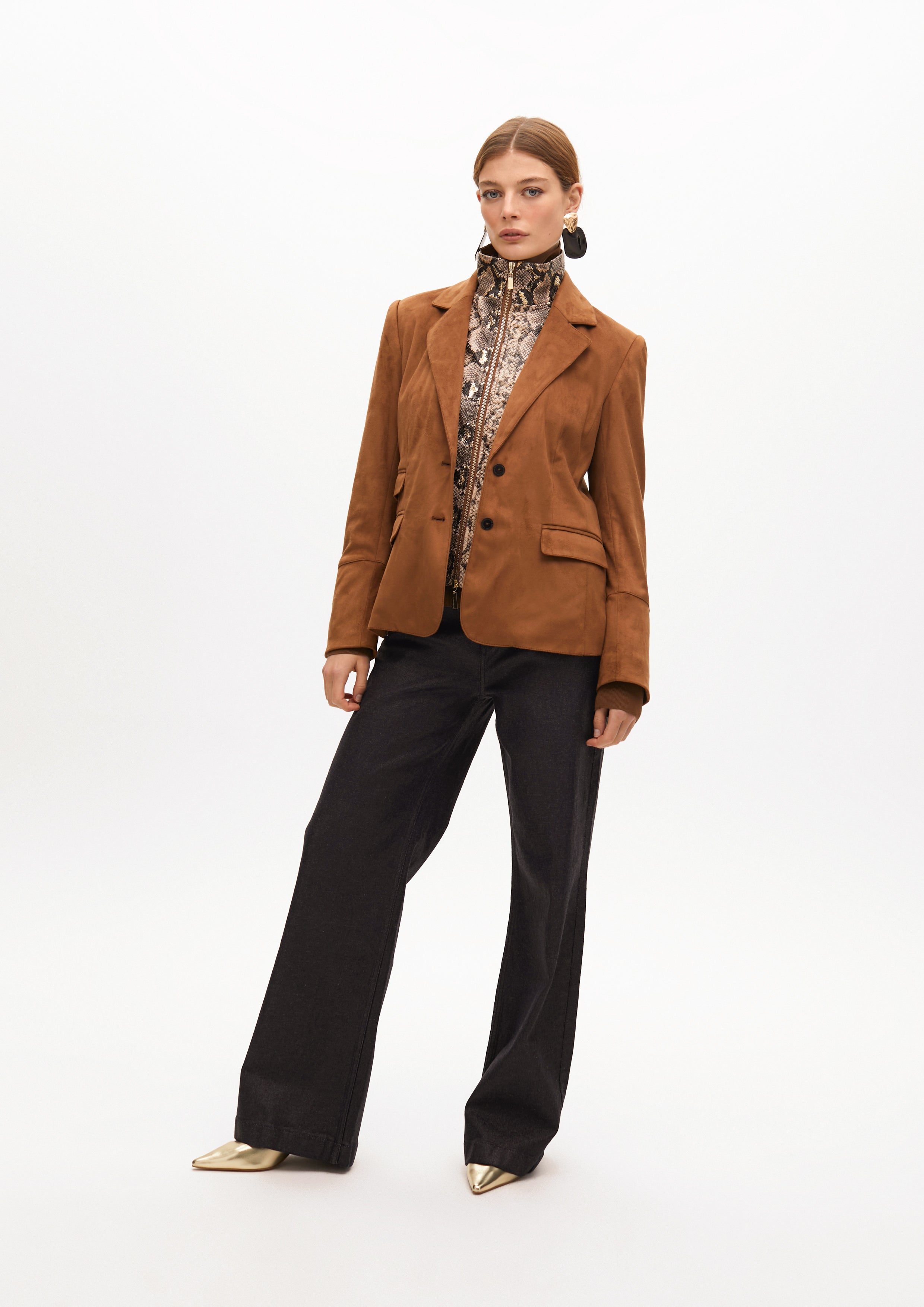 Blazer elegante em antelina com colete interno efeito cobra. Corte ajustado, lapelas clássicas e bolsos com aba. Fecho de botões e zíperes dourados que conferem sofisticação. Ideal para um visual ousado e moderno.