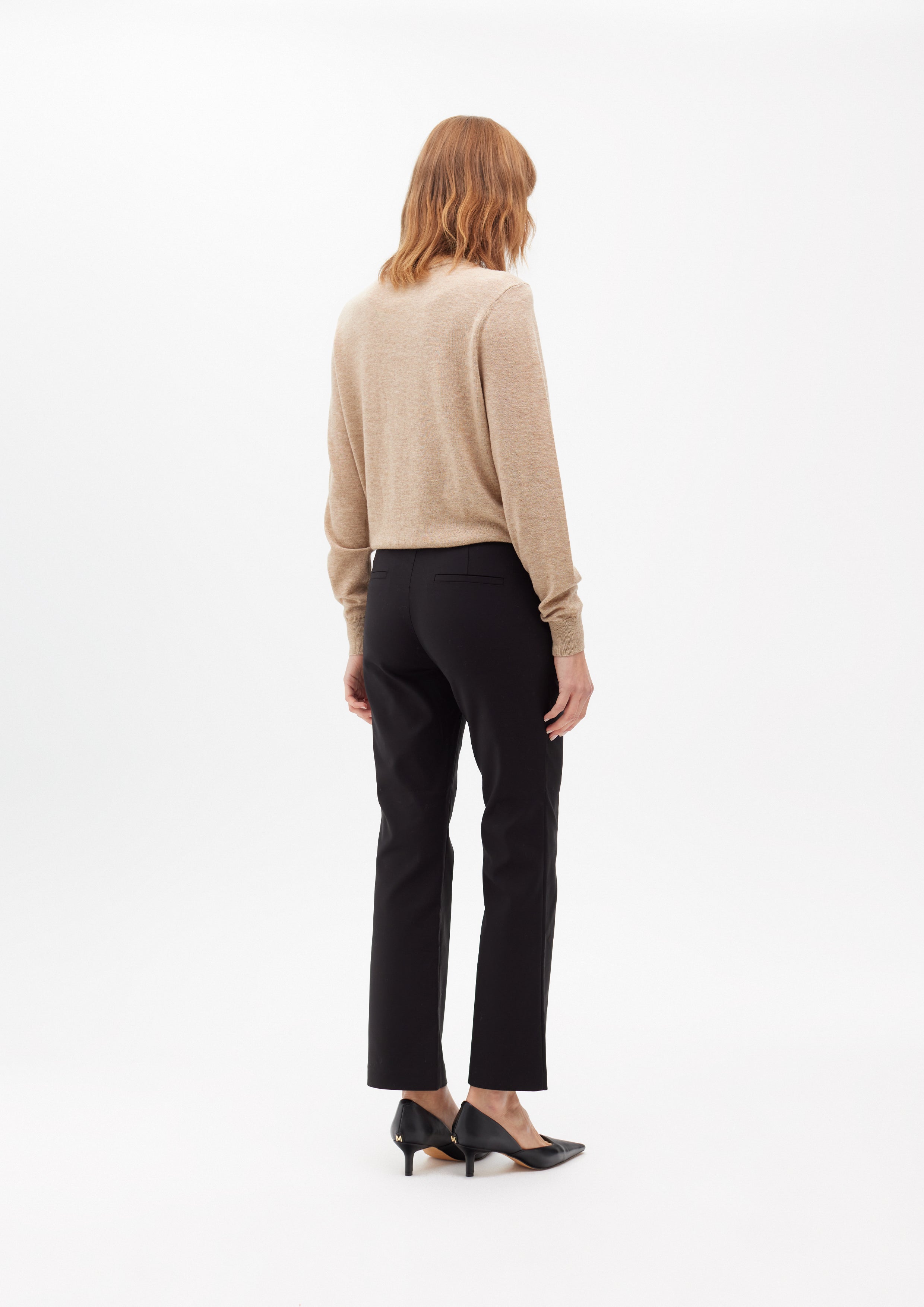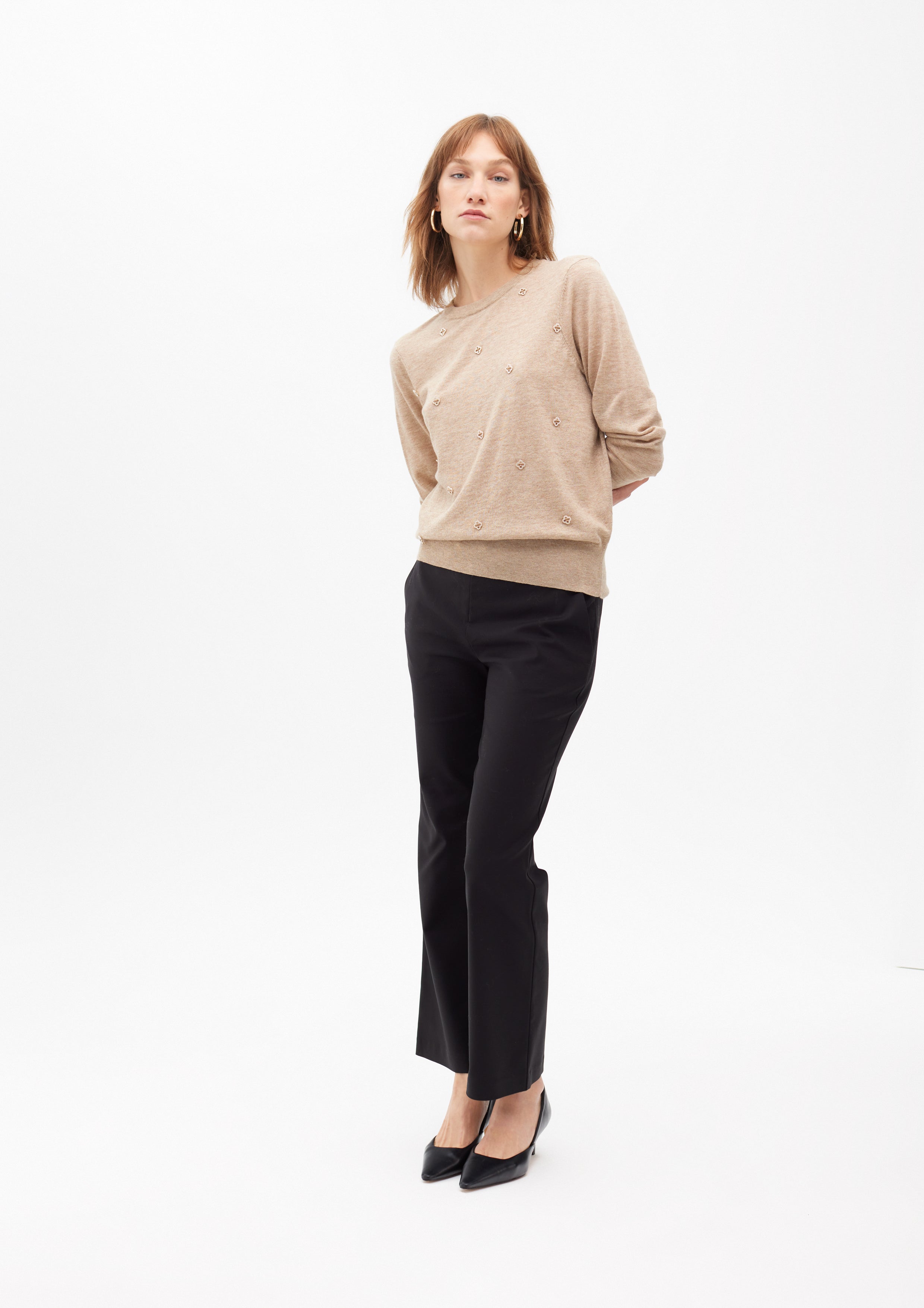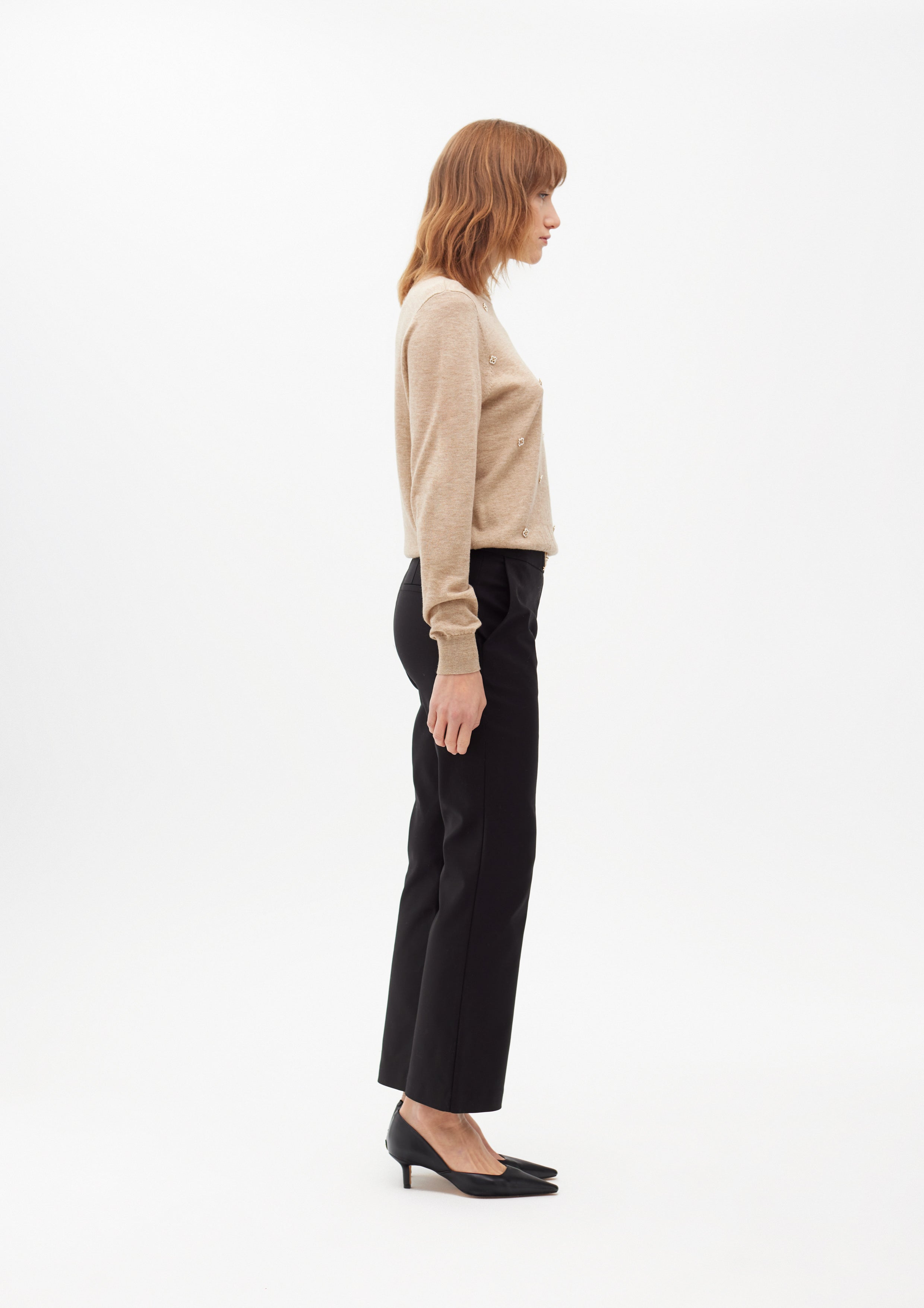 Calças confecionadas em tecido de alta qualidade. Acabamento com detalhe de joia na cintura para elegância. Design intemporal e versátil, perfeito para qualquer ocasião.