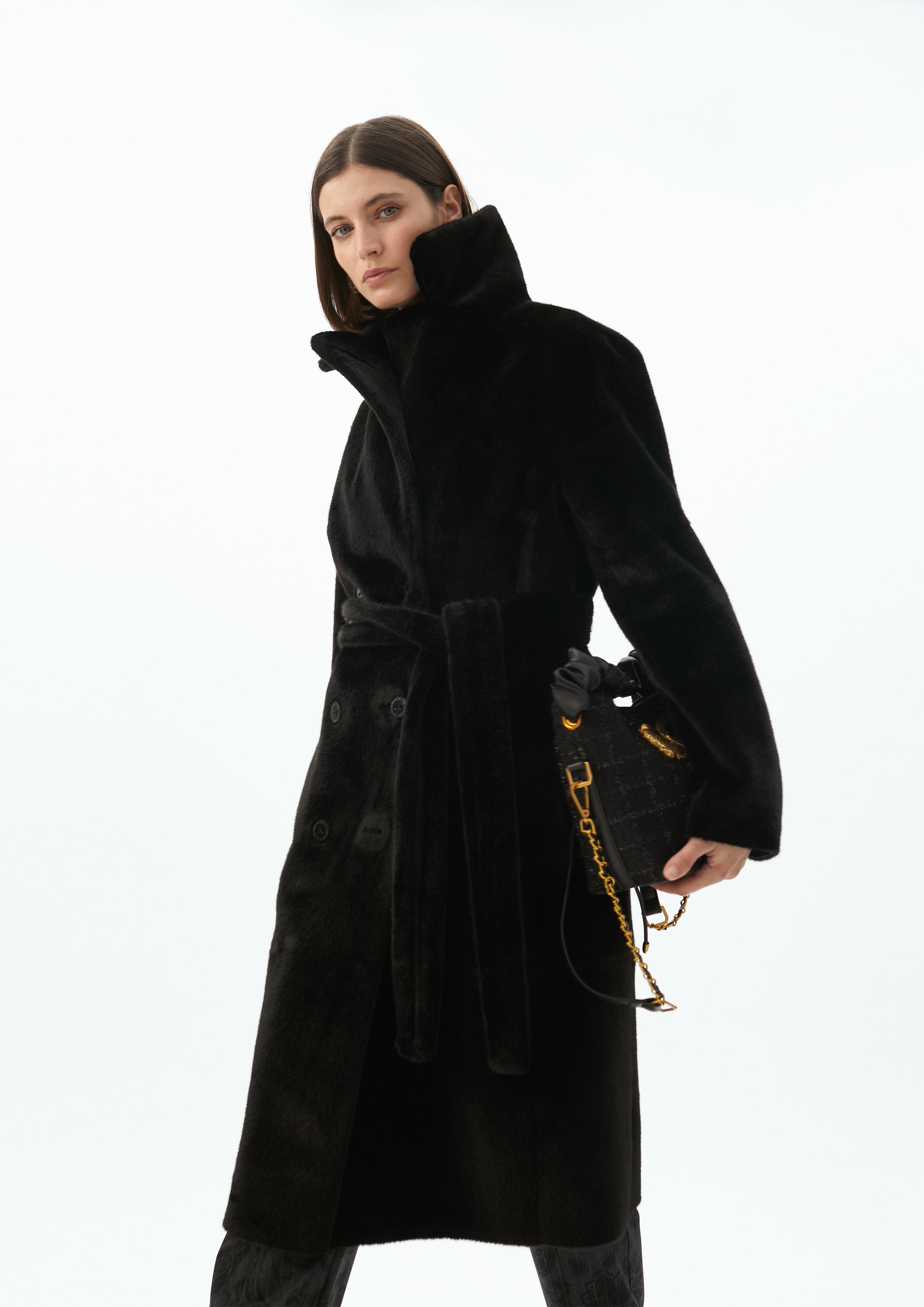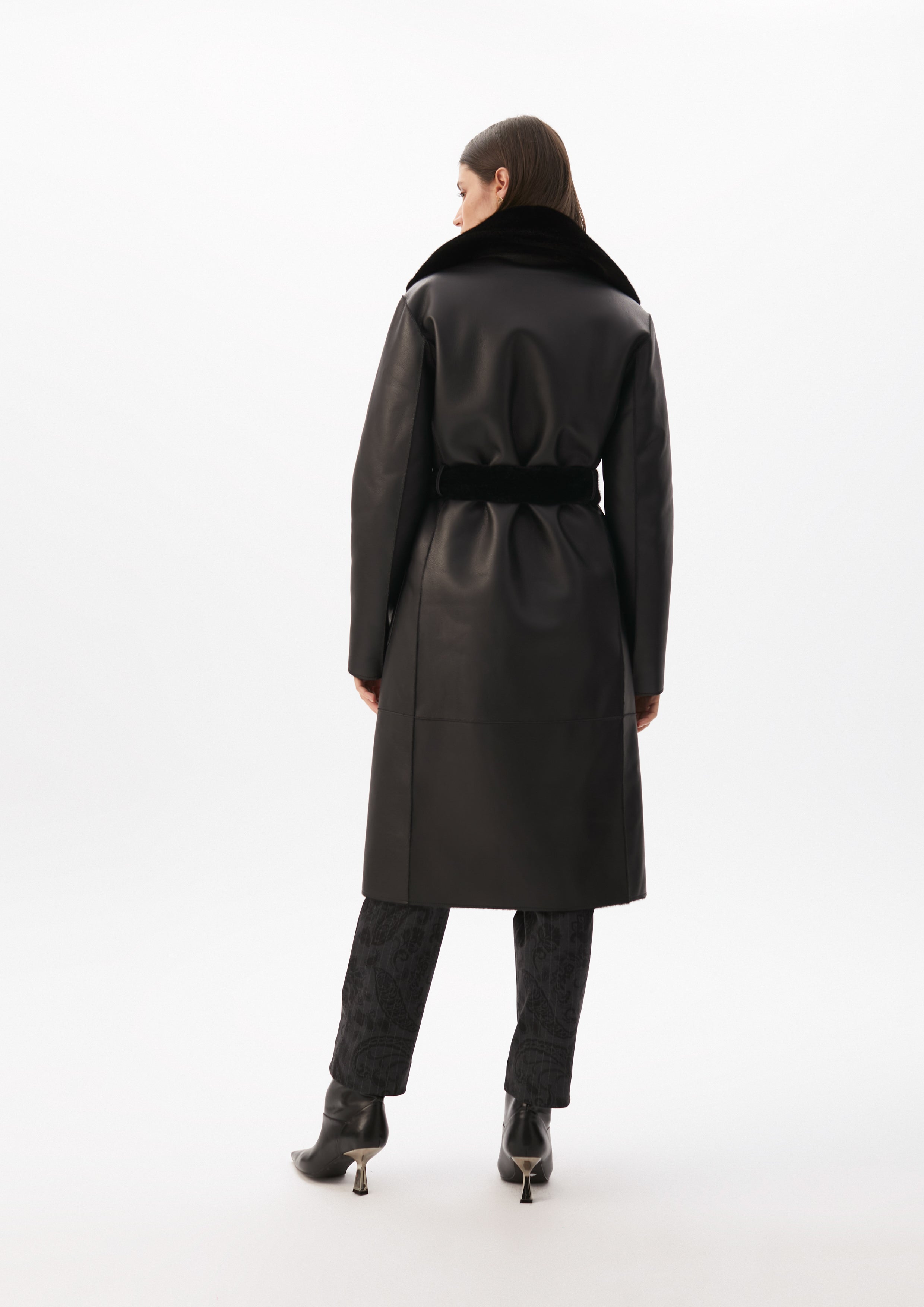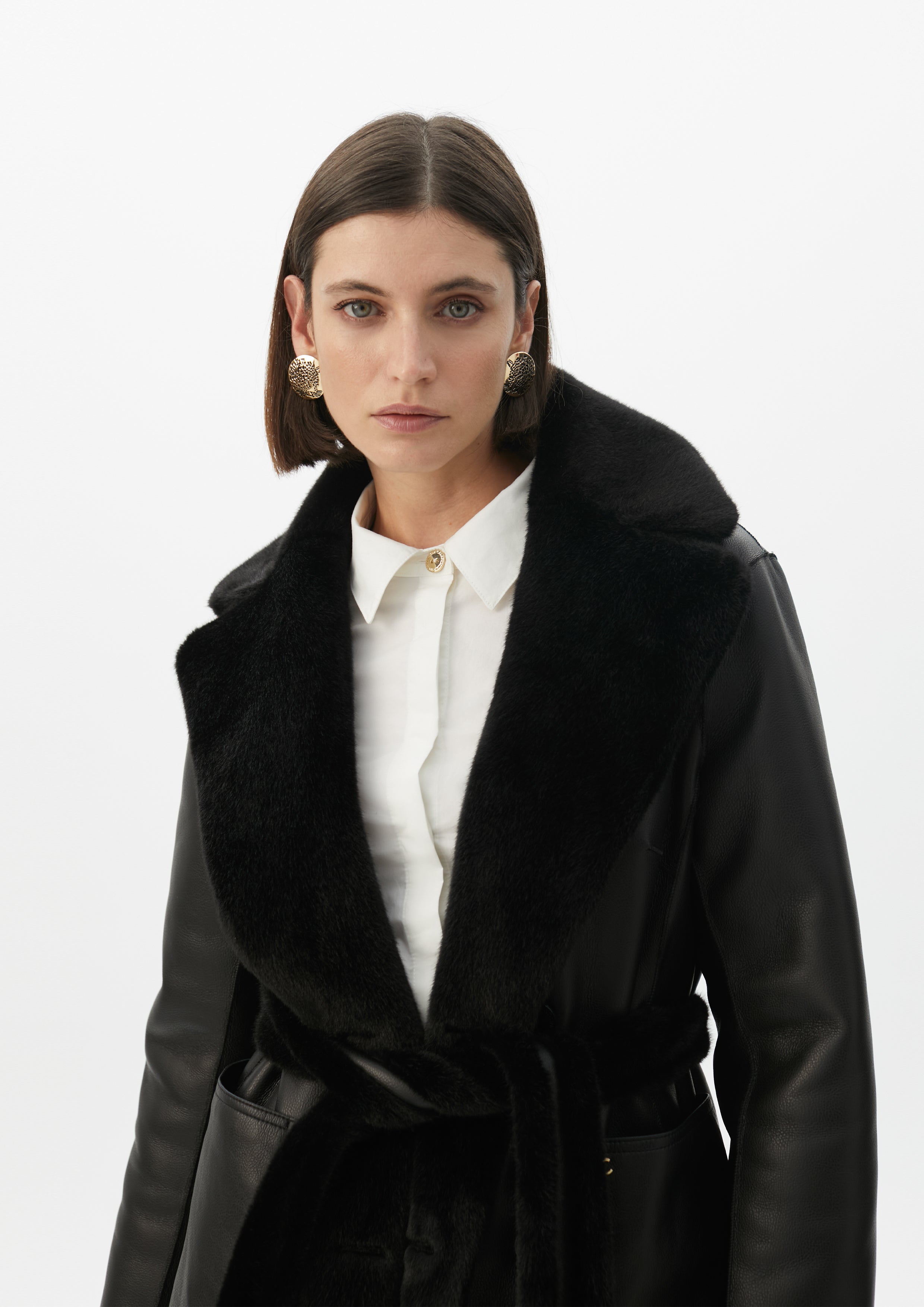 O verdadeiro 2 em 1 Casaco longo elegante em preto em ecopele. Cinturão ajustável, bolsos laterais e fechamento com botões. Ideal para manter-se aquecida com estilo nos dias frios.