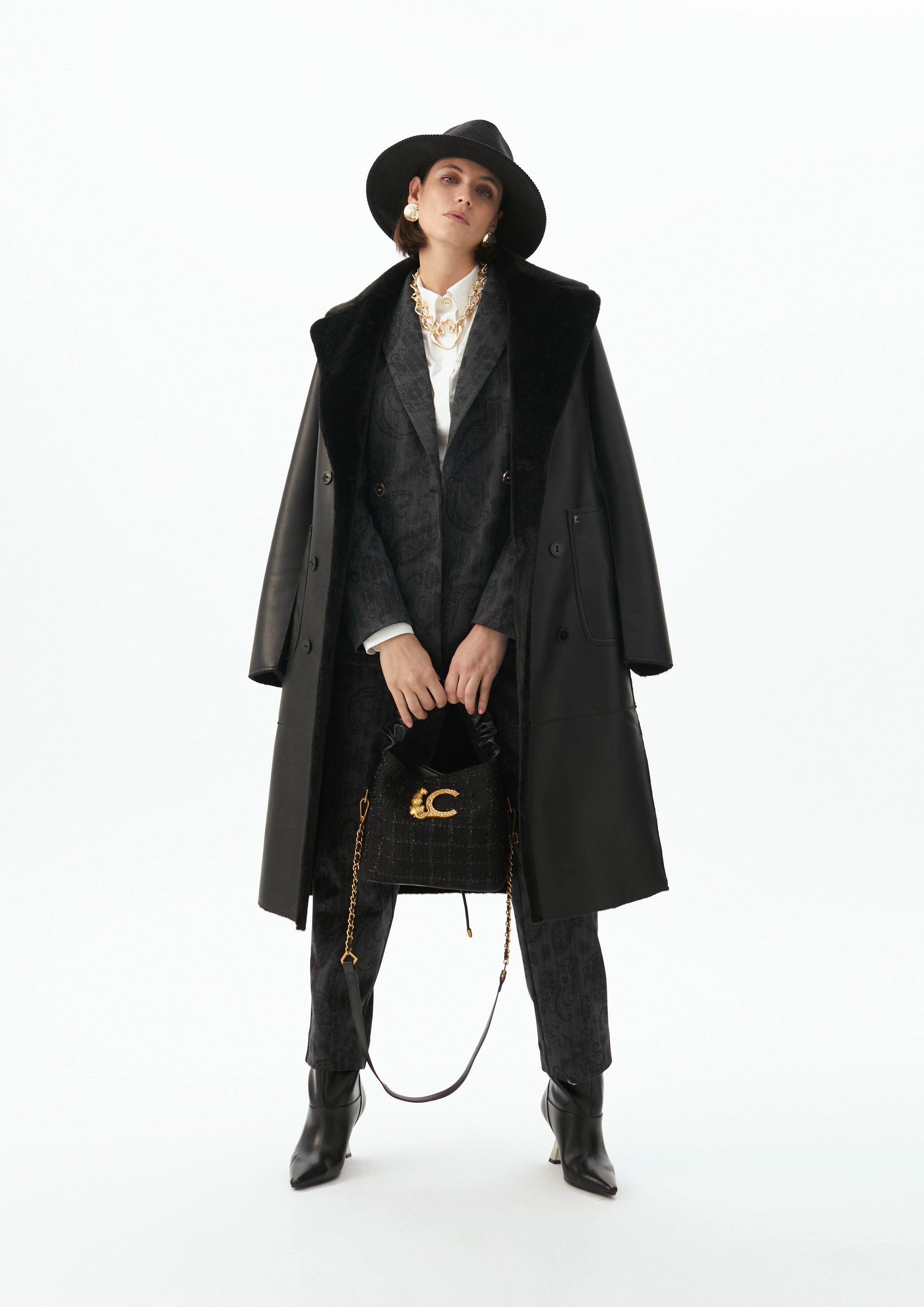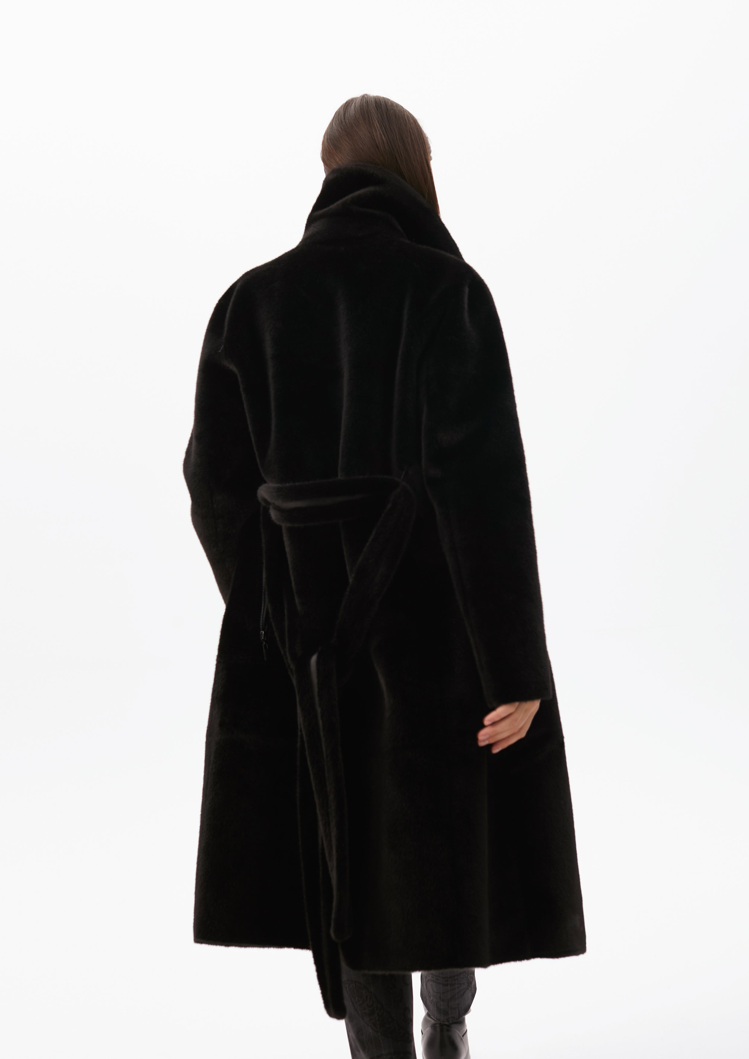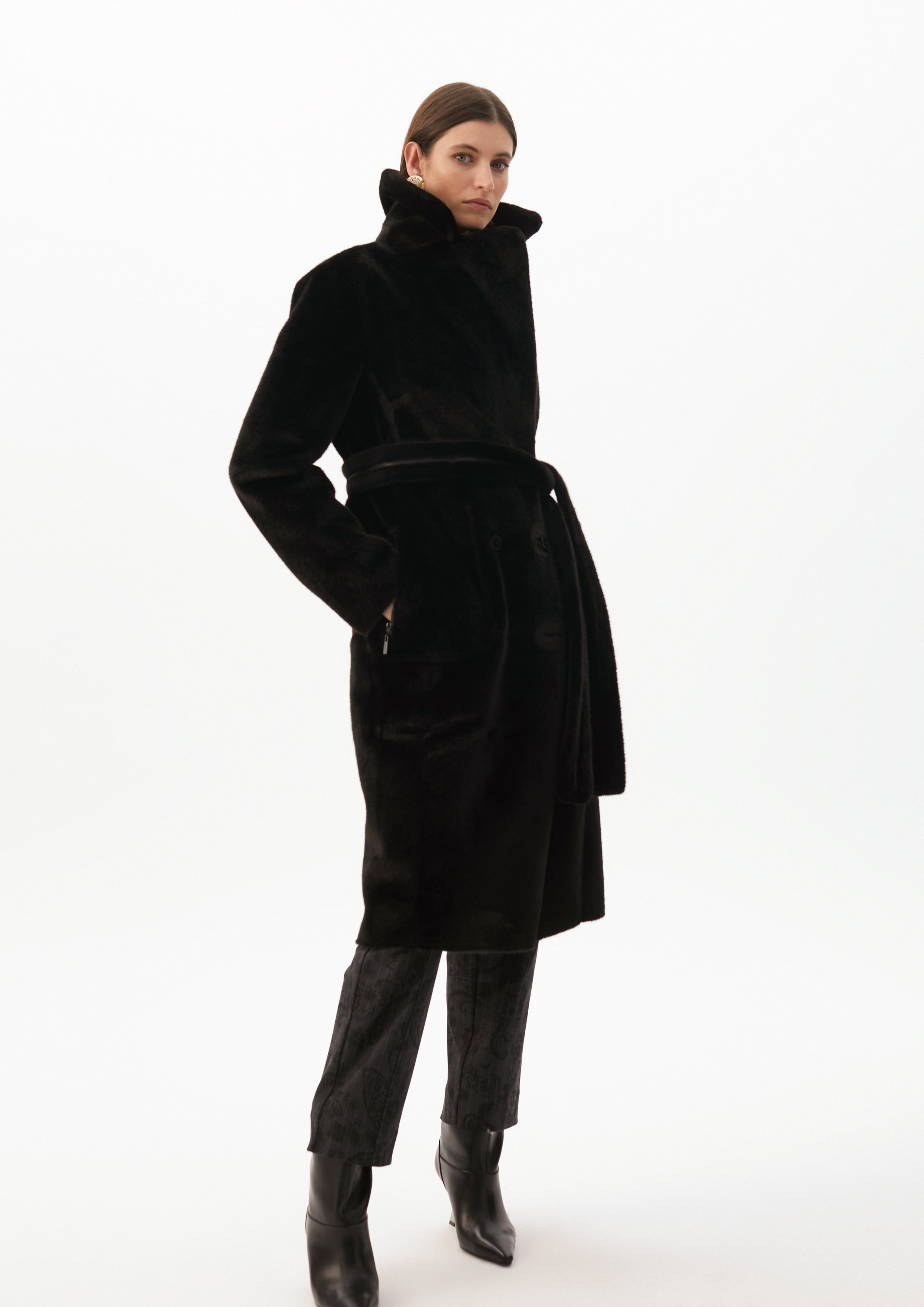 O verdadeiro 2 em 1 Casaco longo elegante em preto em ecopele. Cinturão ajustável, bolsos laterais e fechamento com botões. Ideal para manter-se aquecida com estilo nos dias frios.