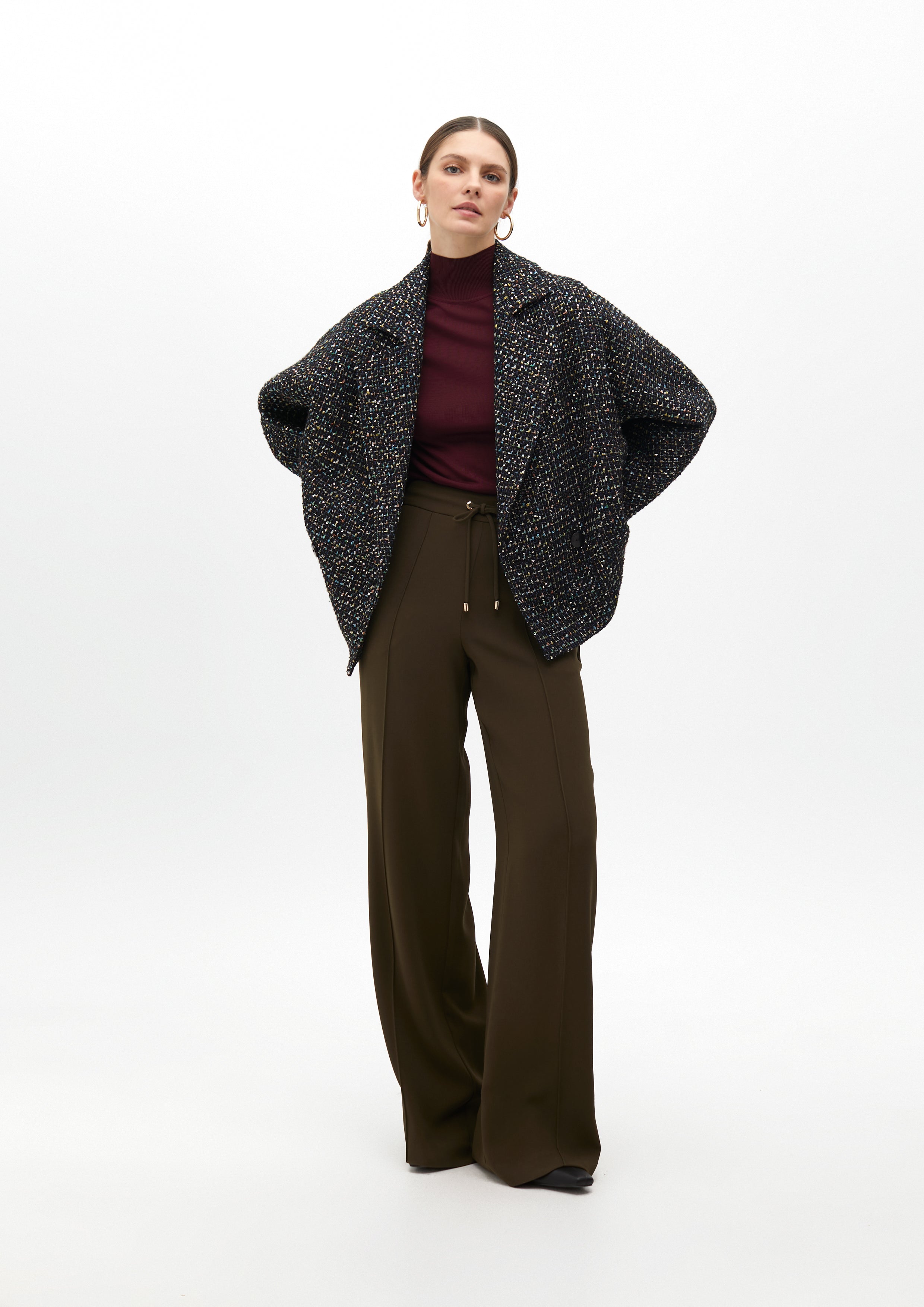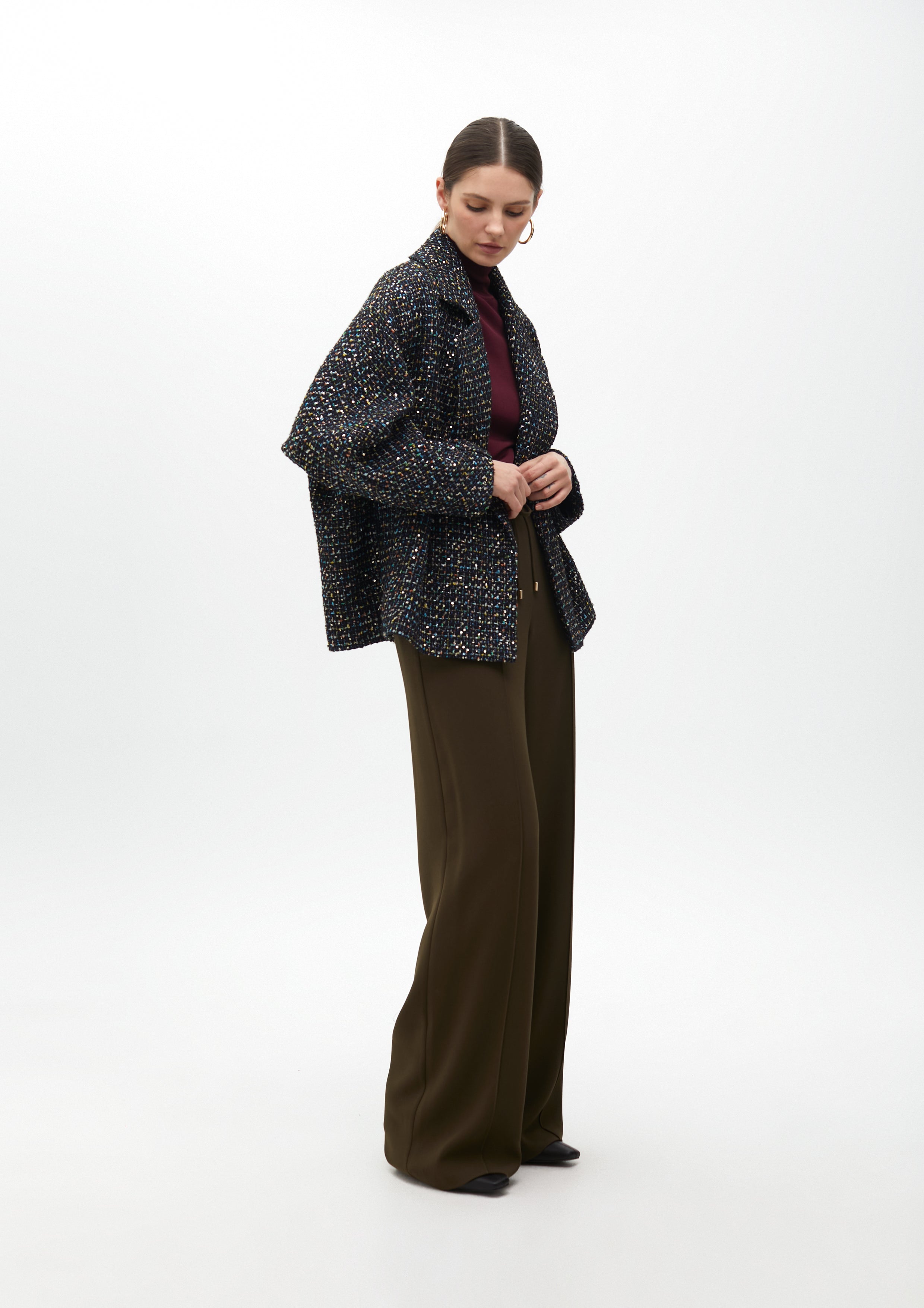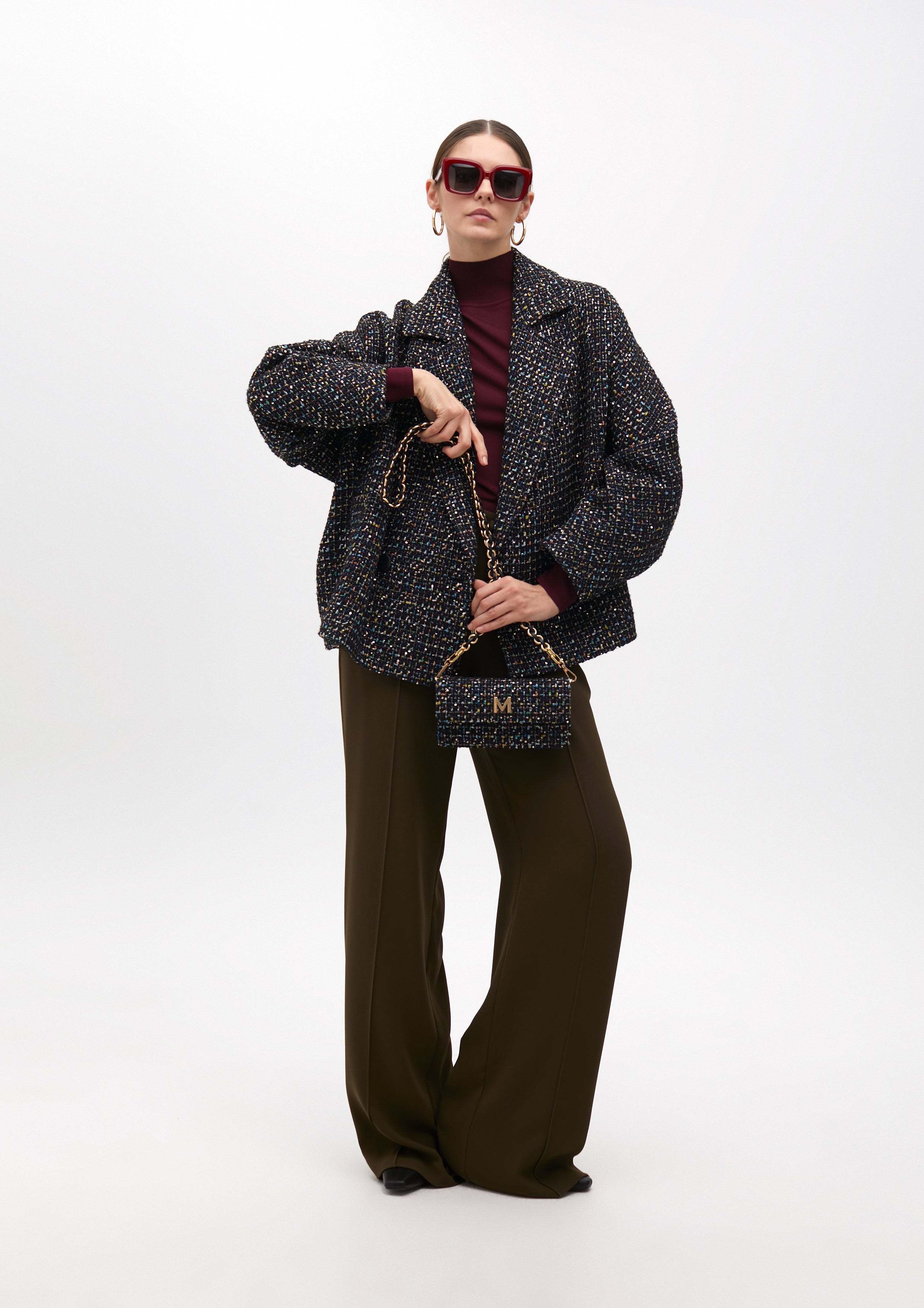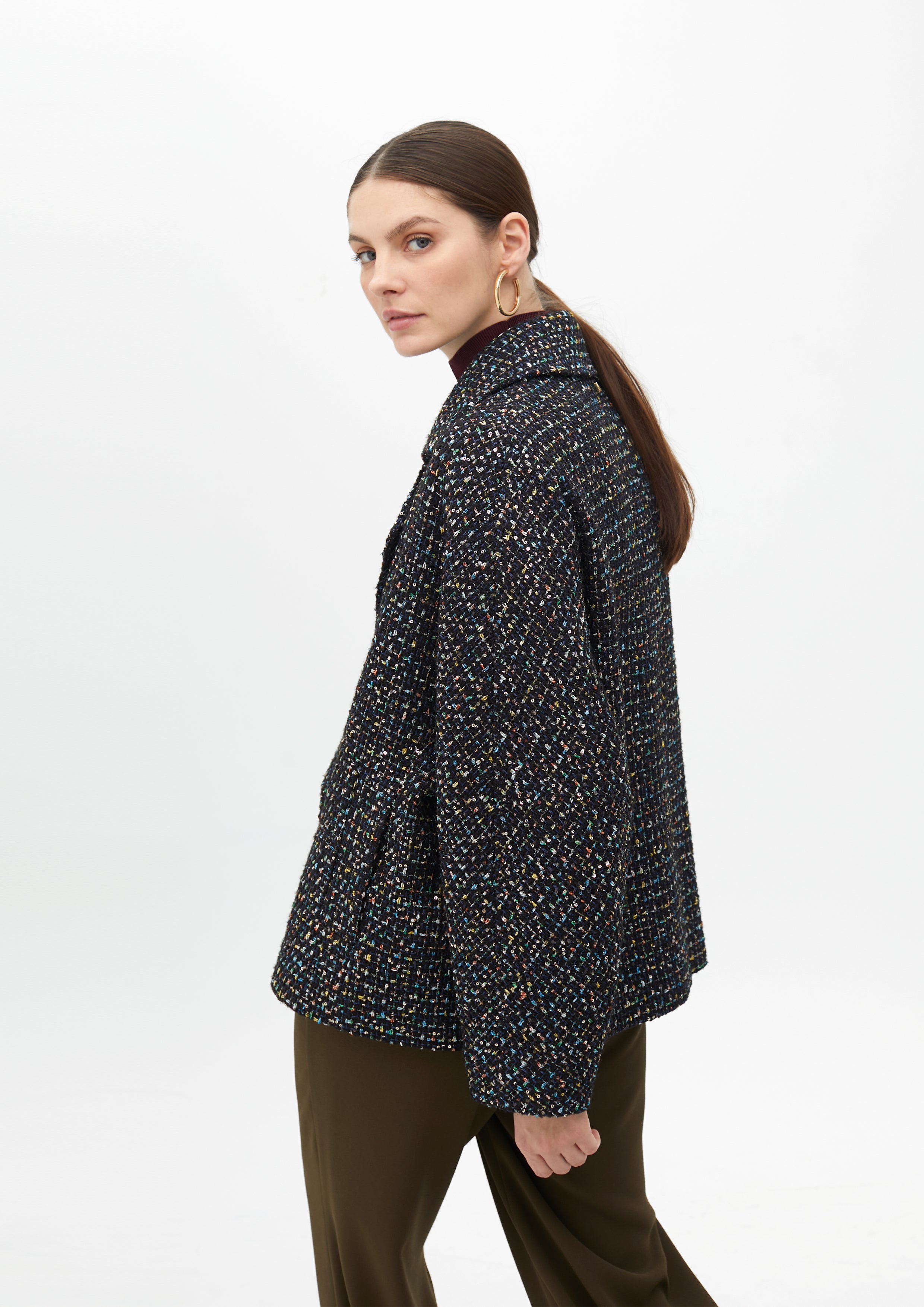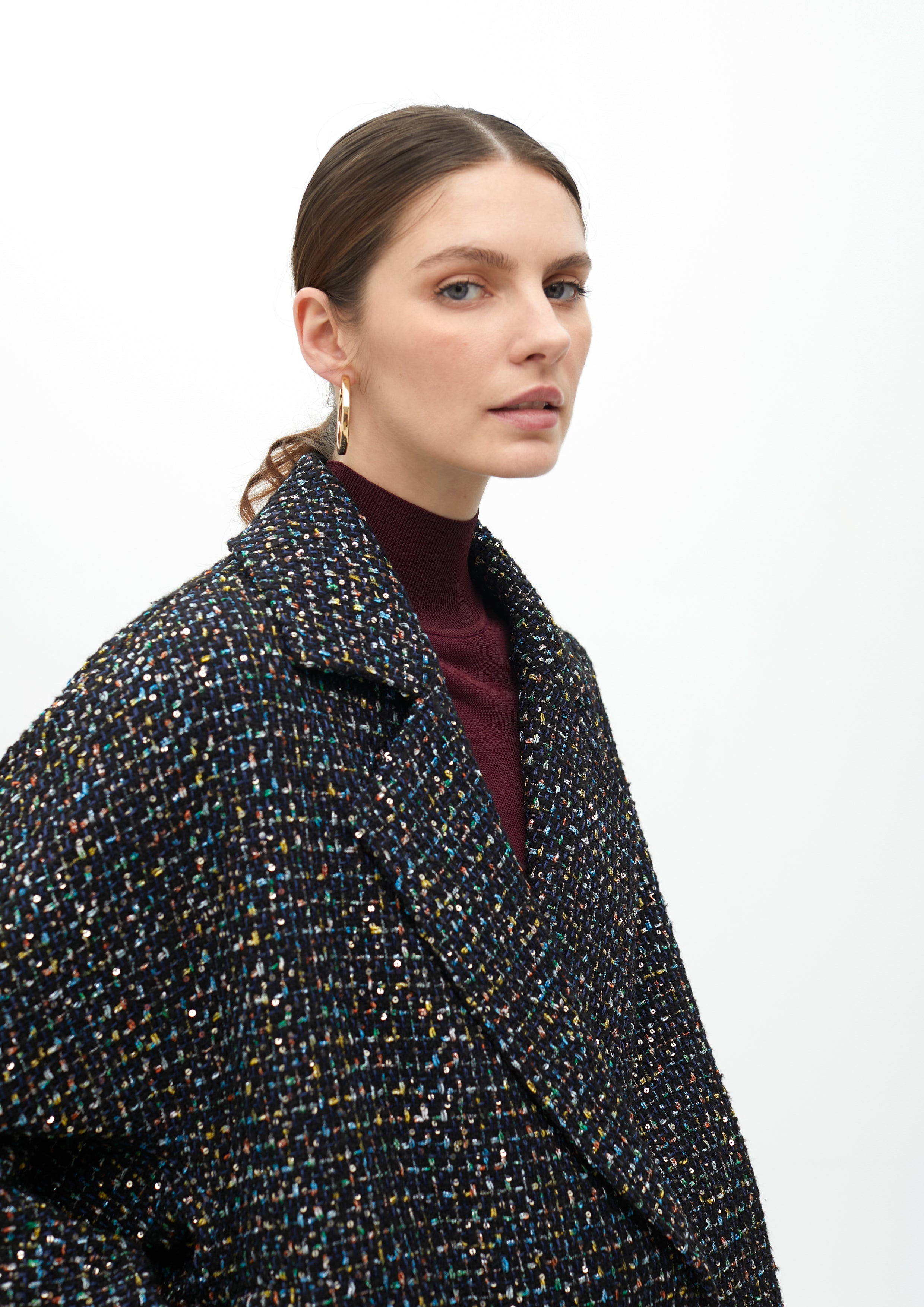 Casaco de tweed com fios multicoloridos em corte clássico. Apresenta design oversize com fecho de abotoamento duplo. Tecido premium para um estilo atemporal. Perfeito para qualquer look diurno.