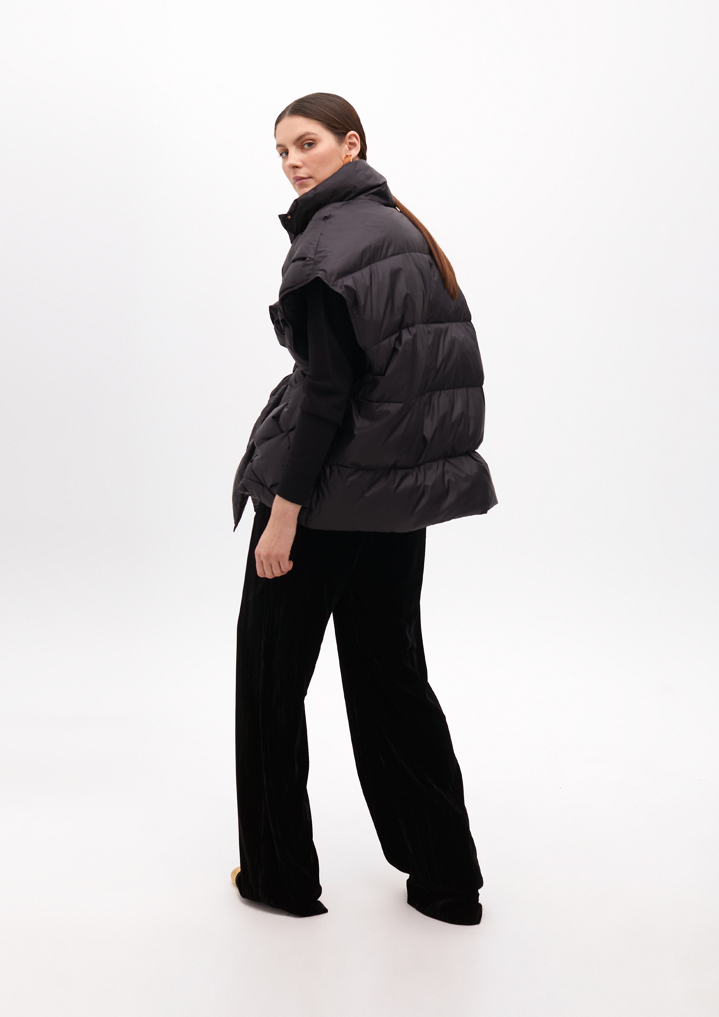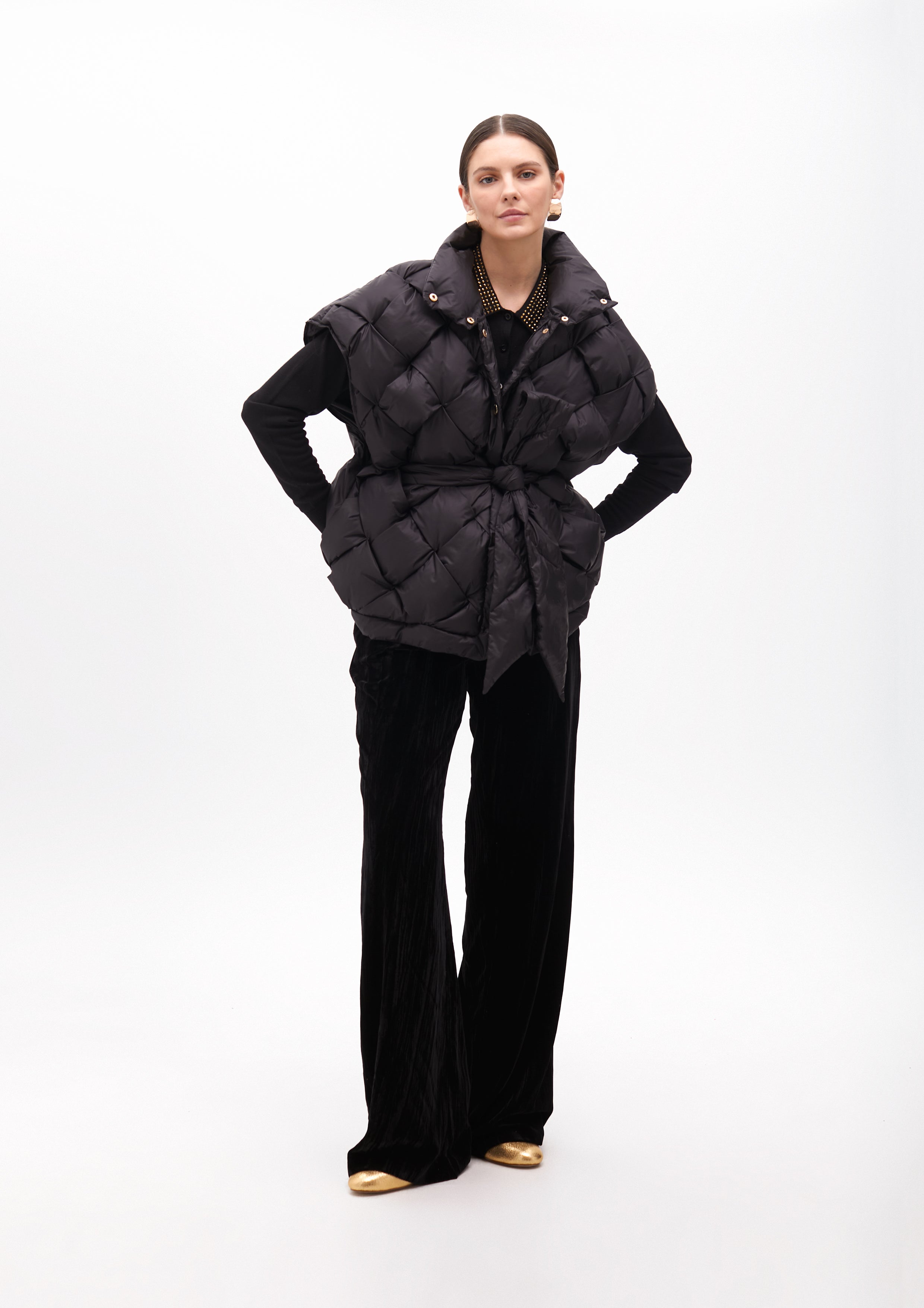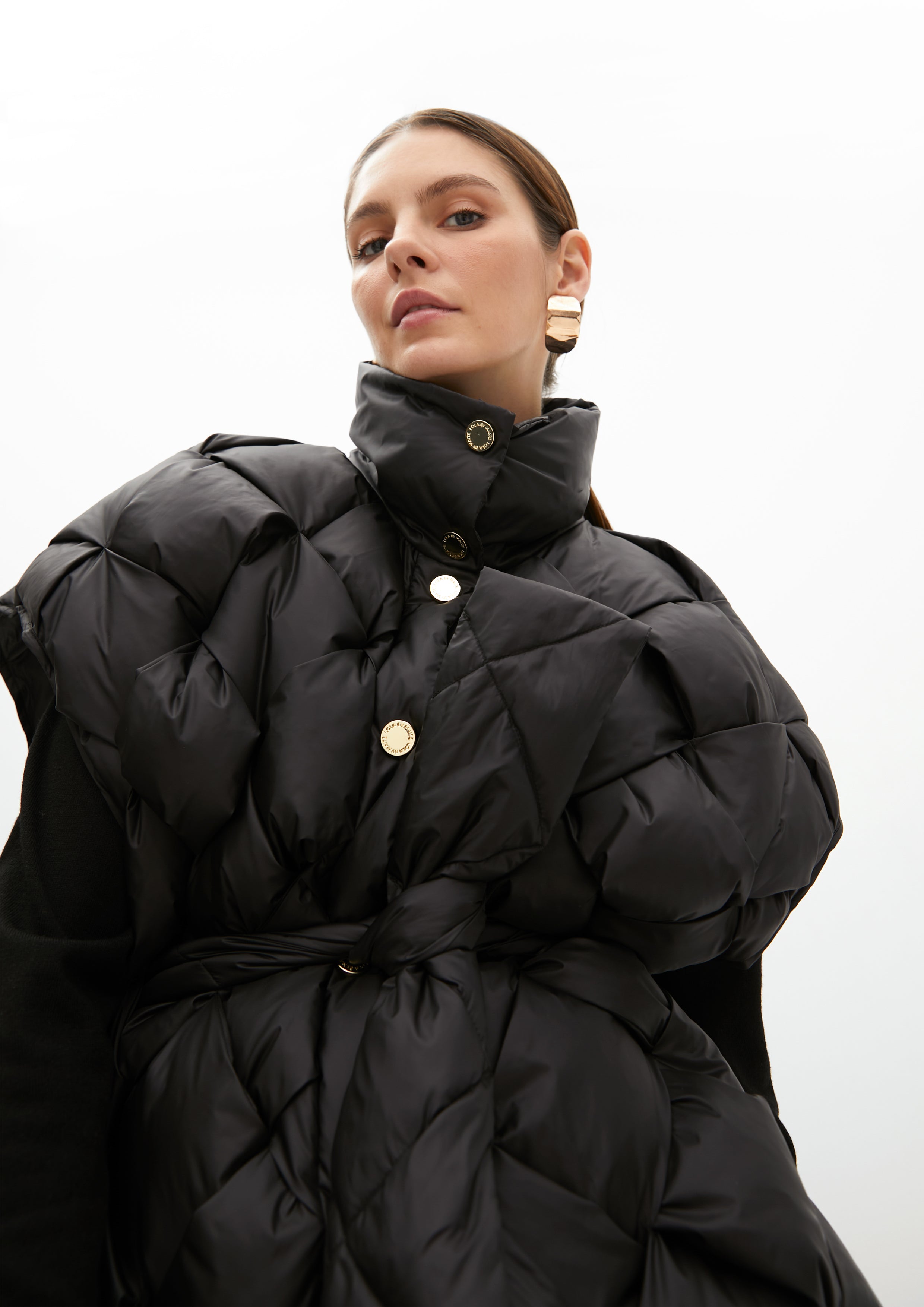 Colete acolchoado com design trançado e fecho frontal de botões. Inclui cinto de tecido para um ajuste personalizado. Feito de material leve e resistente à água. Sua gola alta oferece proteção extra contra o frio.