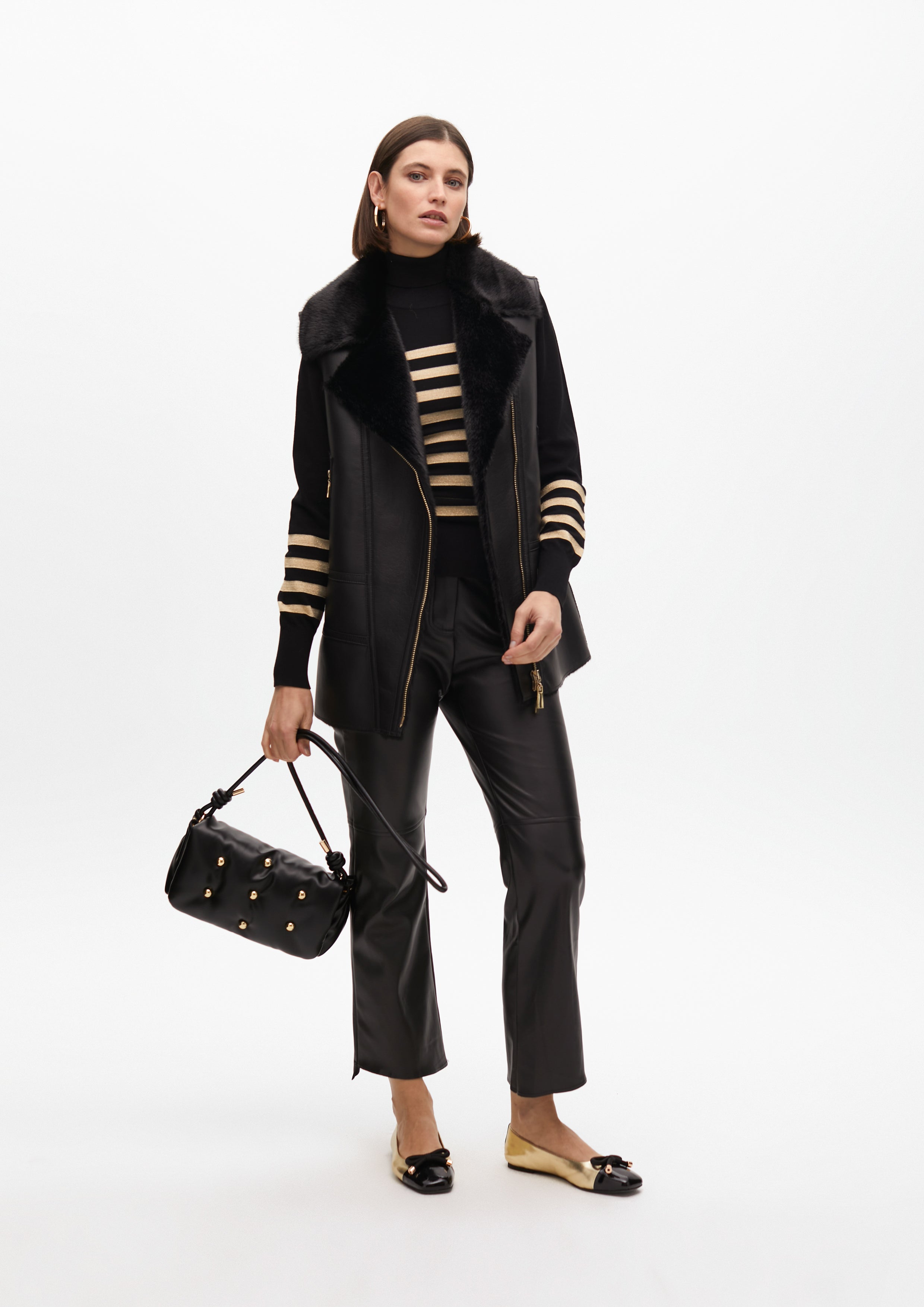 Colete reversível midi elegante em preto, confeccionado em pele sintética com interior de pelo macio. Fecho frontal assimétrico com zíper dourado e bolsos laterais. Um design versátil para um estilo elegante.