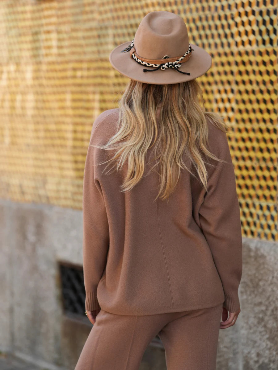 Camisola em malha macia de corte reto e descontraído. Gola redonda, punhos canelados e detalhe central subtil. Elegância e conforto num só look.
