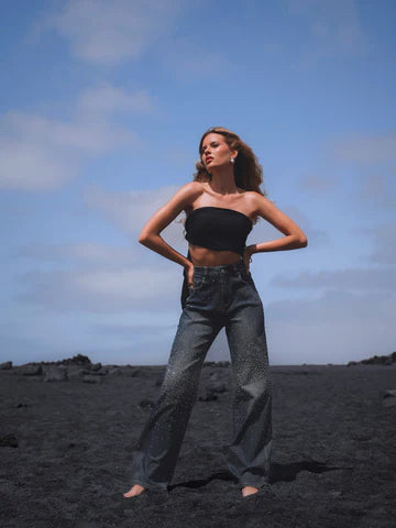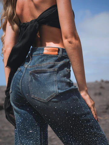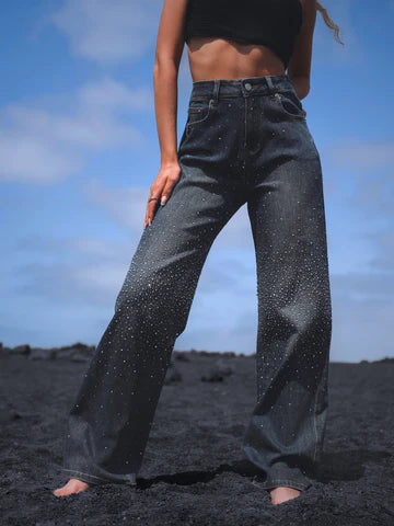 jeans de corte wide leg em ganga escura com aplicações de tachas brilhantes em toda a perna. Design de cintura subida e lavagem uniforme.