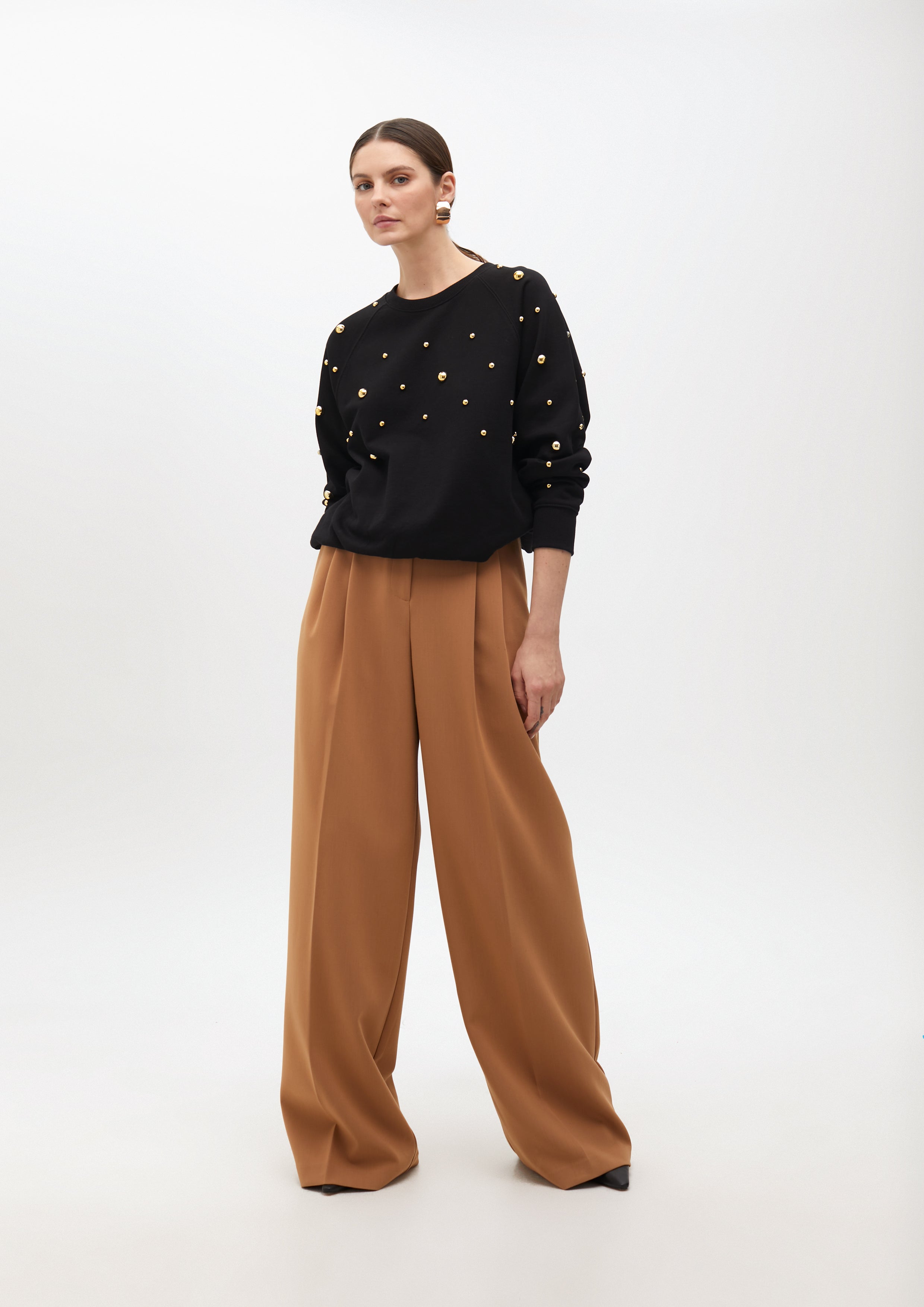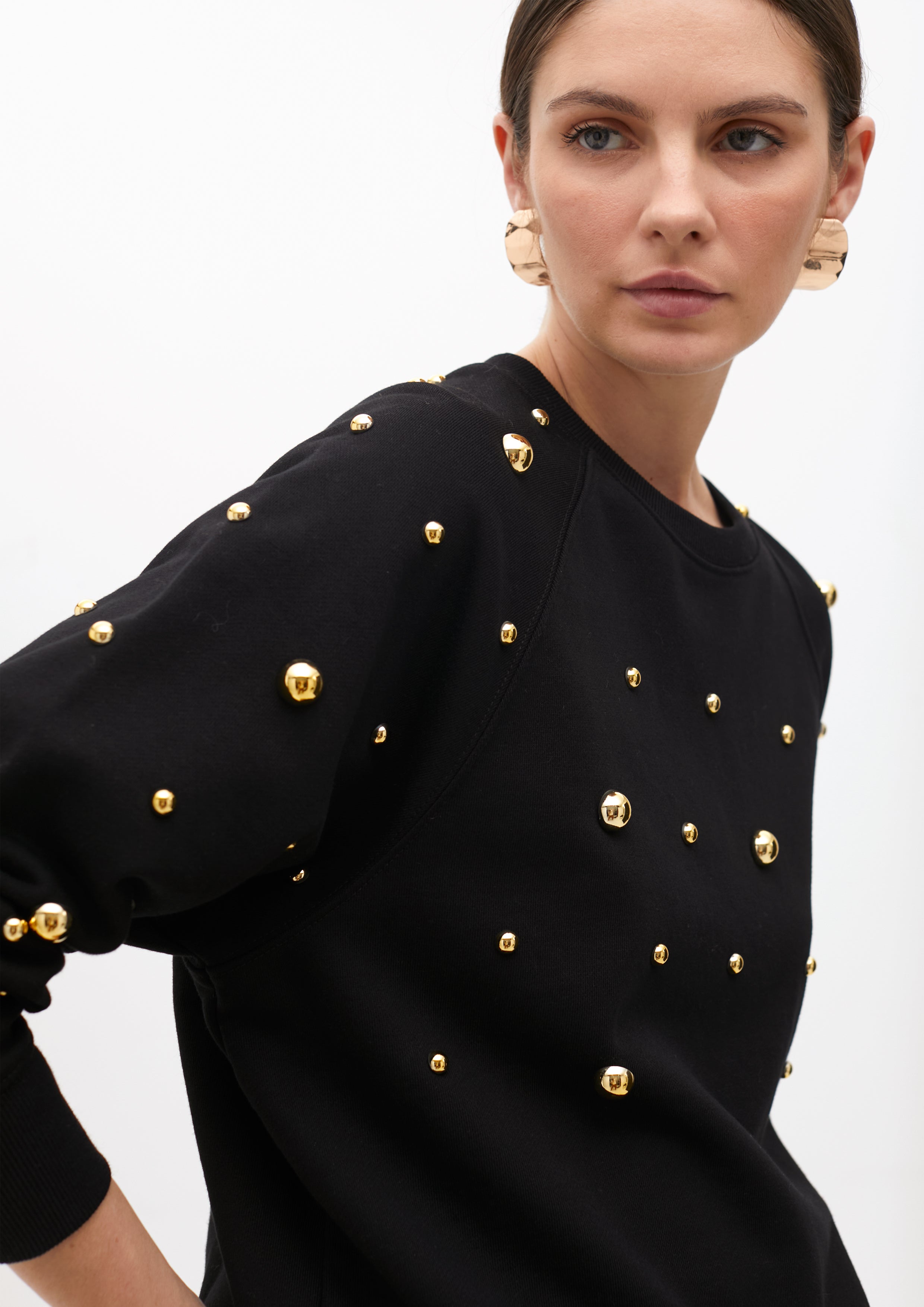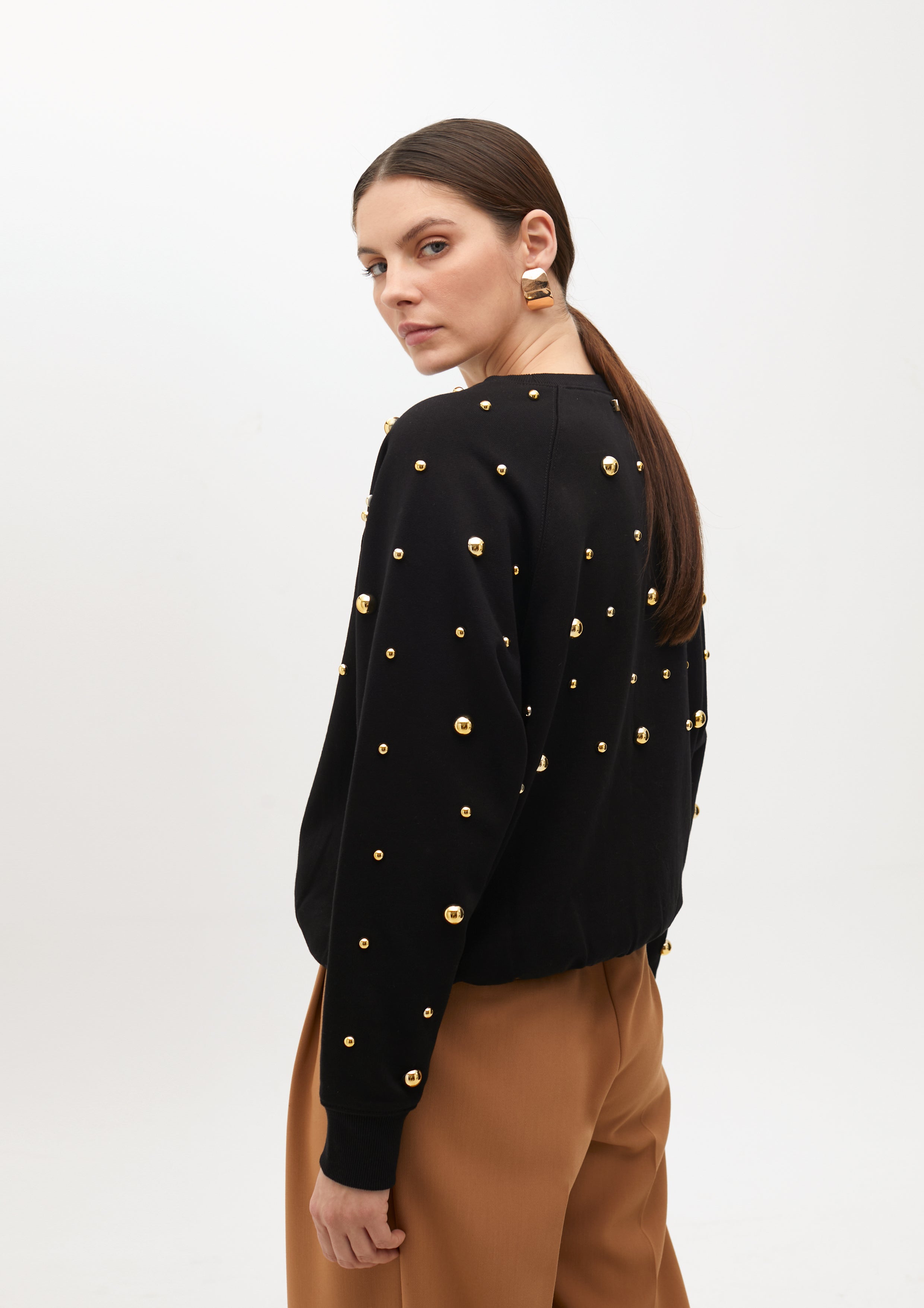 Moletom de algodão com gola redonda e mangas compridas. Apresenta tachas redondas douradas distribuídas de forma uniforme, conferindo um estilo moderno e sofisticado. Acabamento canelado no punho e na barra para um ajuste confortável.