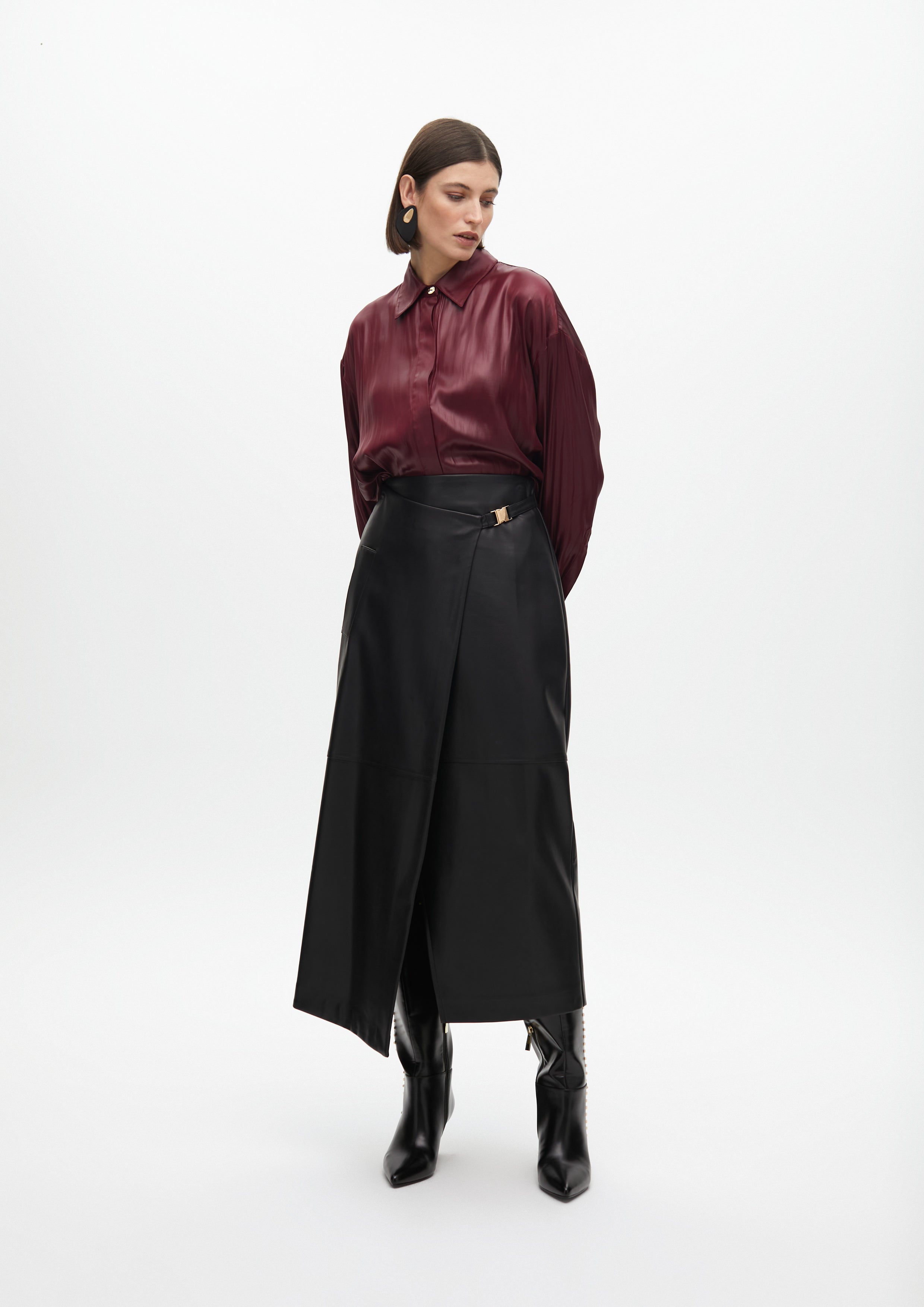 Saia lápis sofisticada com efeito couro e detalhe lateral assimétrico. Design cruzado com fecho de fivela dourada. Ideal para um look elegante e moderno.