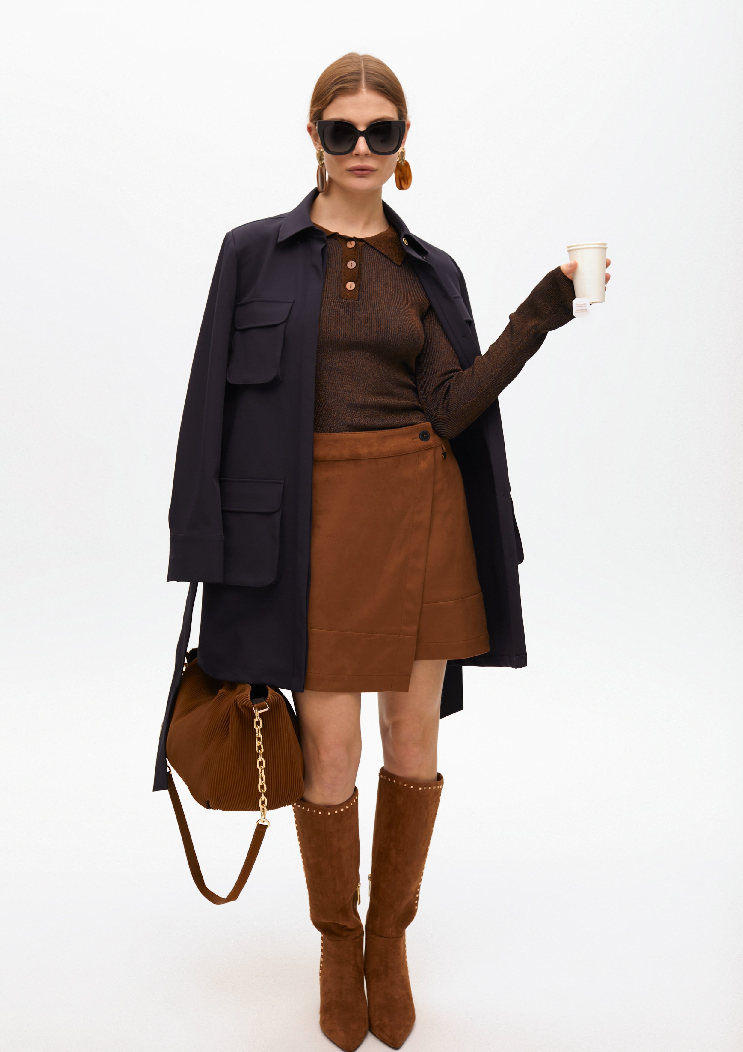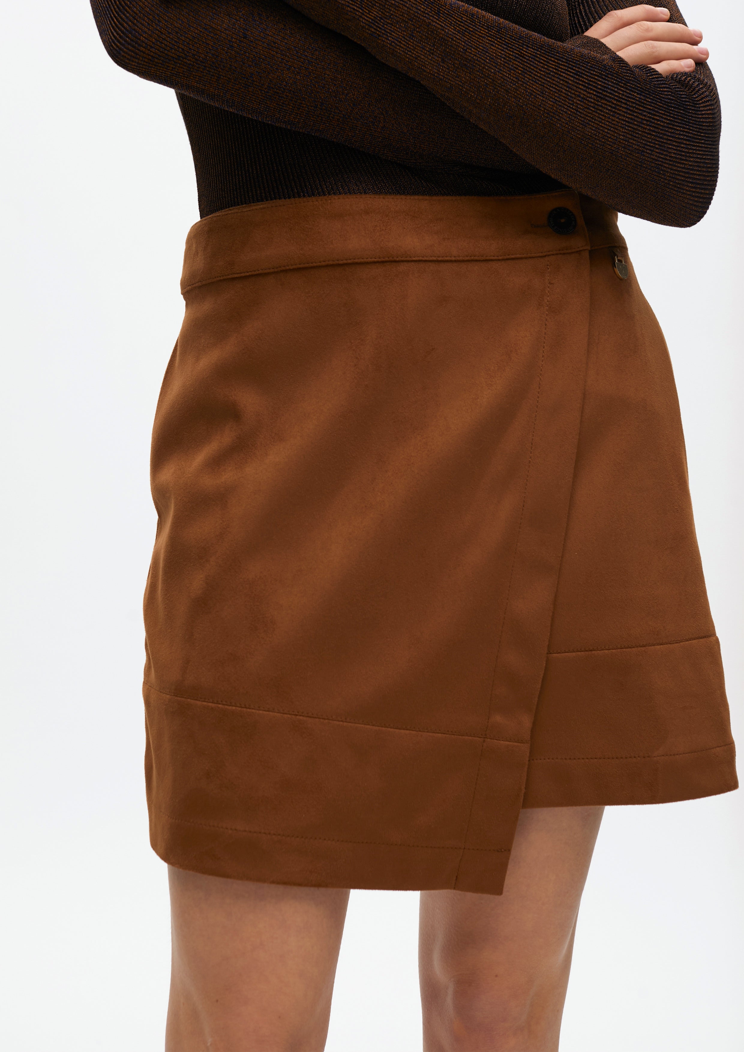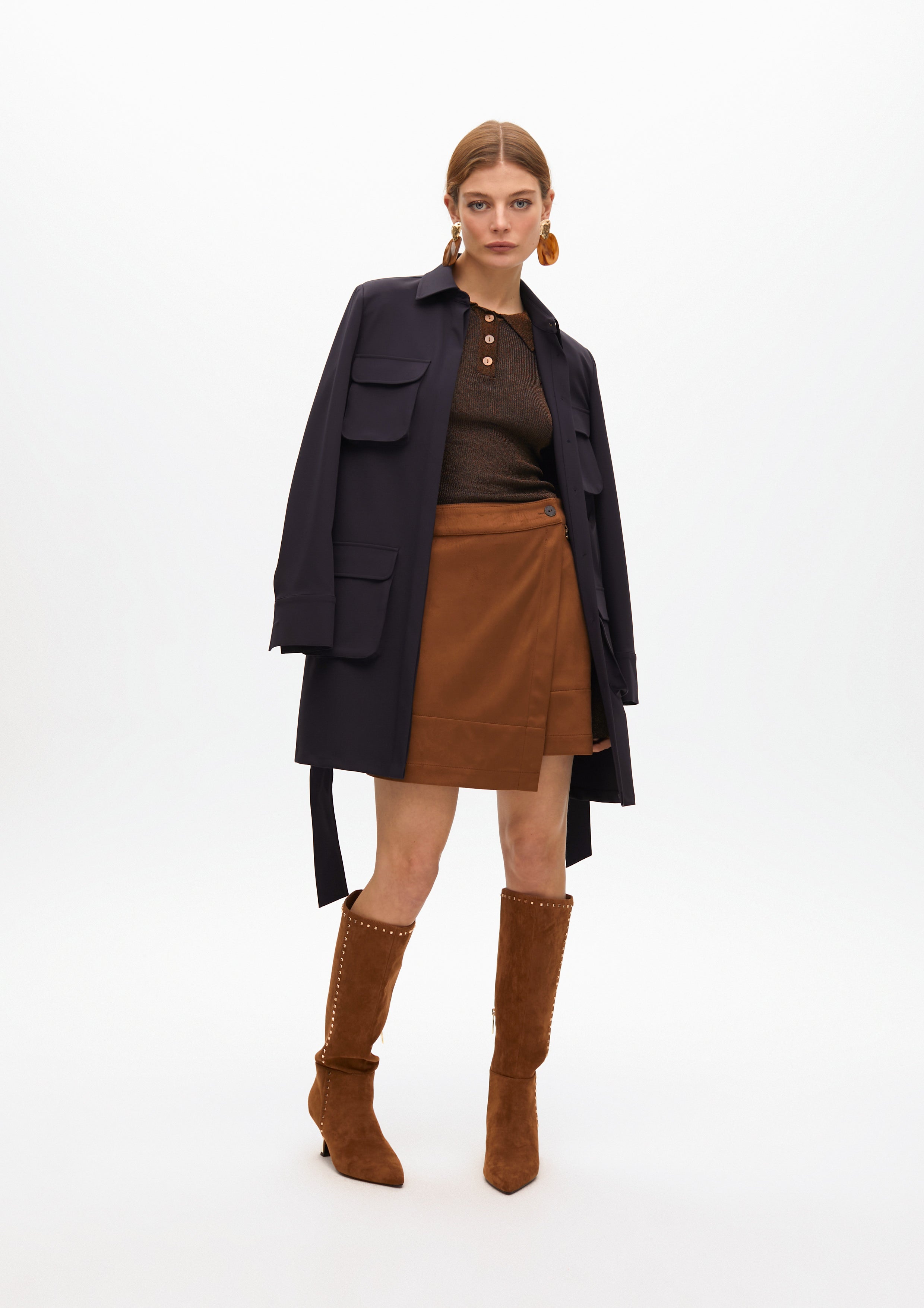 Elegante saia mini em camurça suave com abertura frontal. Projetada com fecho de botão lateral e detalhe de logotipo metálico. Perfeita para um estilo sofisticado e moderno.