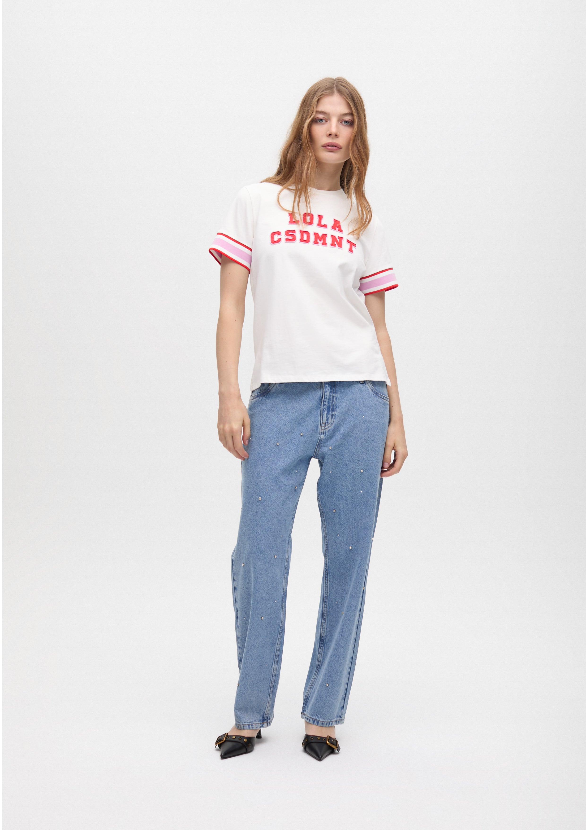 T-shirt branca de algodão com detalhe de mangas rib e logotipo Lola CSDMNT na frente. Corte reto e gola redonda. Ideal para um look casual com um toque distinto. Complete seu estilo com esta peça exclusiva da Lola Casademunt.