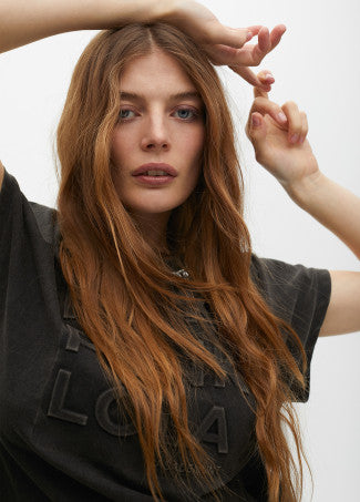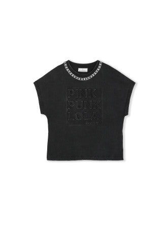 Camiseta de manga curta em tecido lavado com detalhe de joias no pescoço. Design com inscrição em relevo na frente. Ideal para adicionar um toque sofisticado a qualquer conjunto casual. Fabricada com materiais de alta qualidade para garantir conforto.