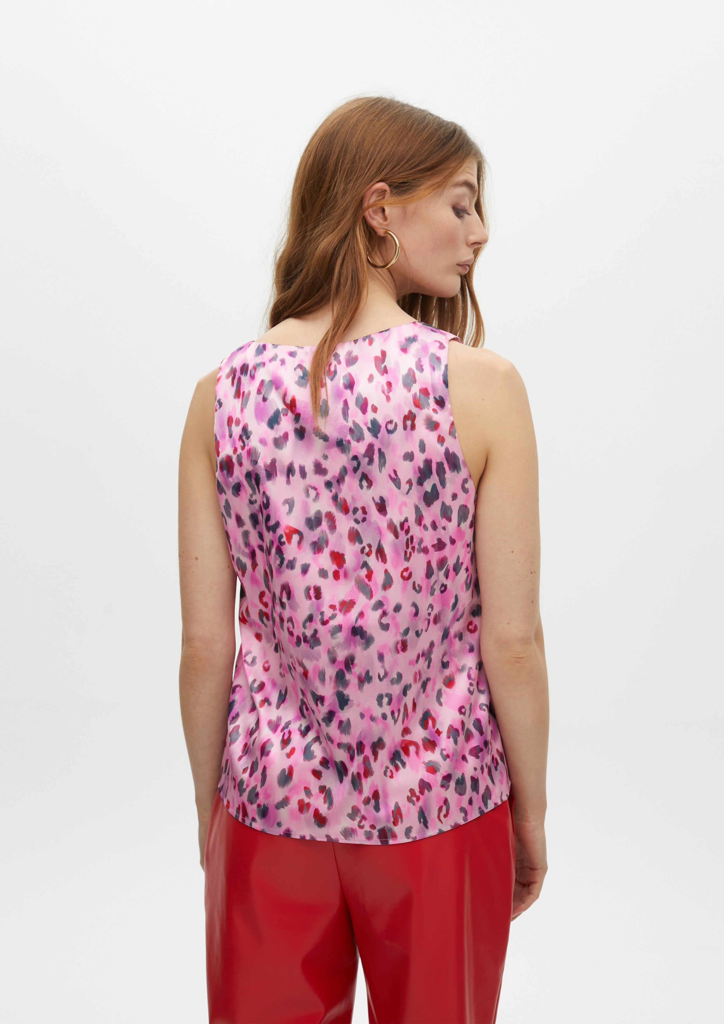 Top sem mangas com estampa abstrata em tons vibrantes. Decote em V e corte fluido que confere um toque sofisticado. Detalhe de logotipo metálico nas costas. Ideal para combinar com calças de primavera ou acessórios a condizer.