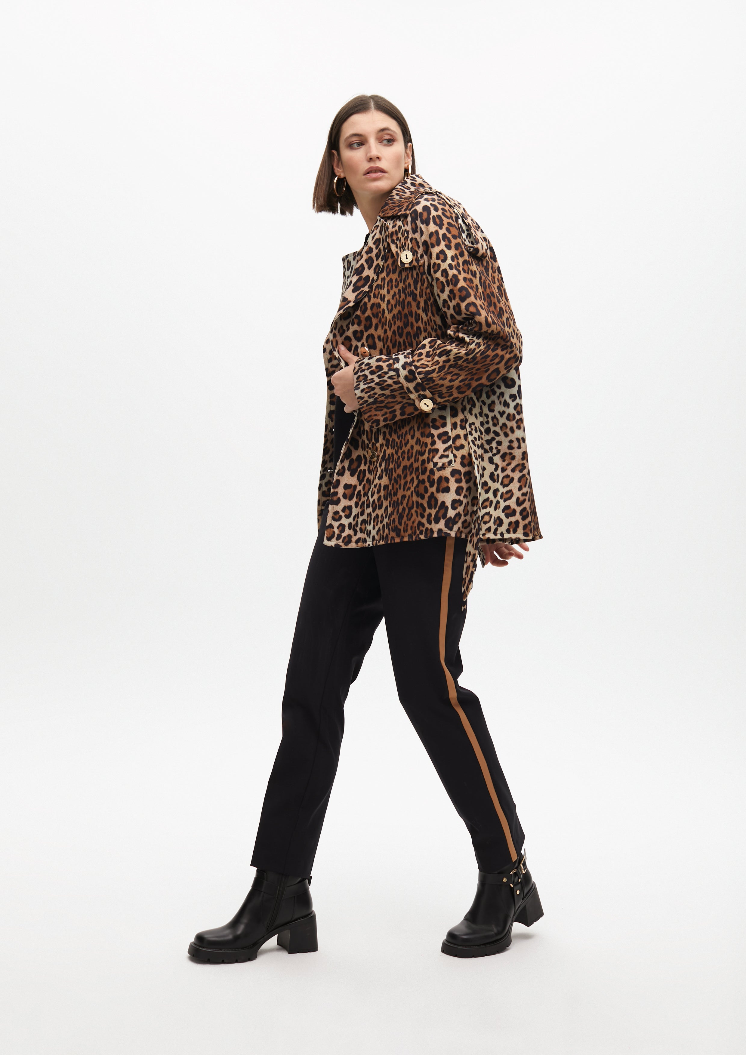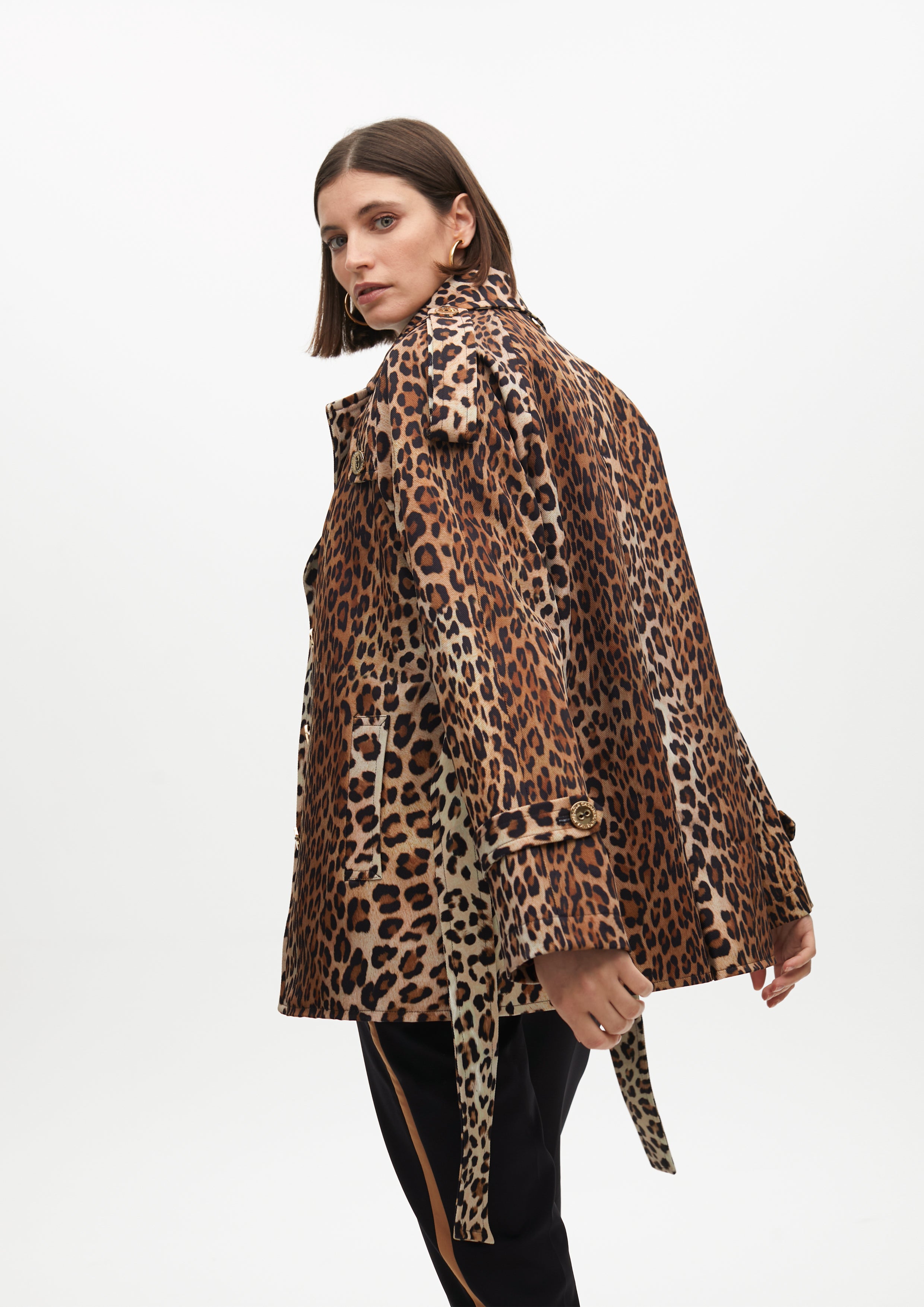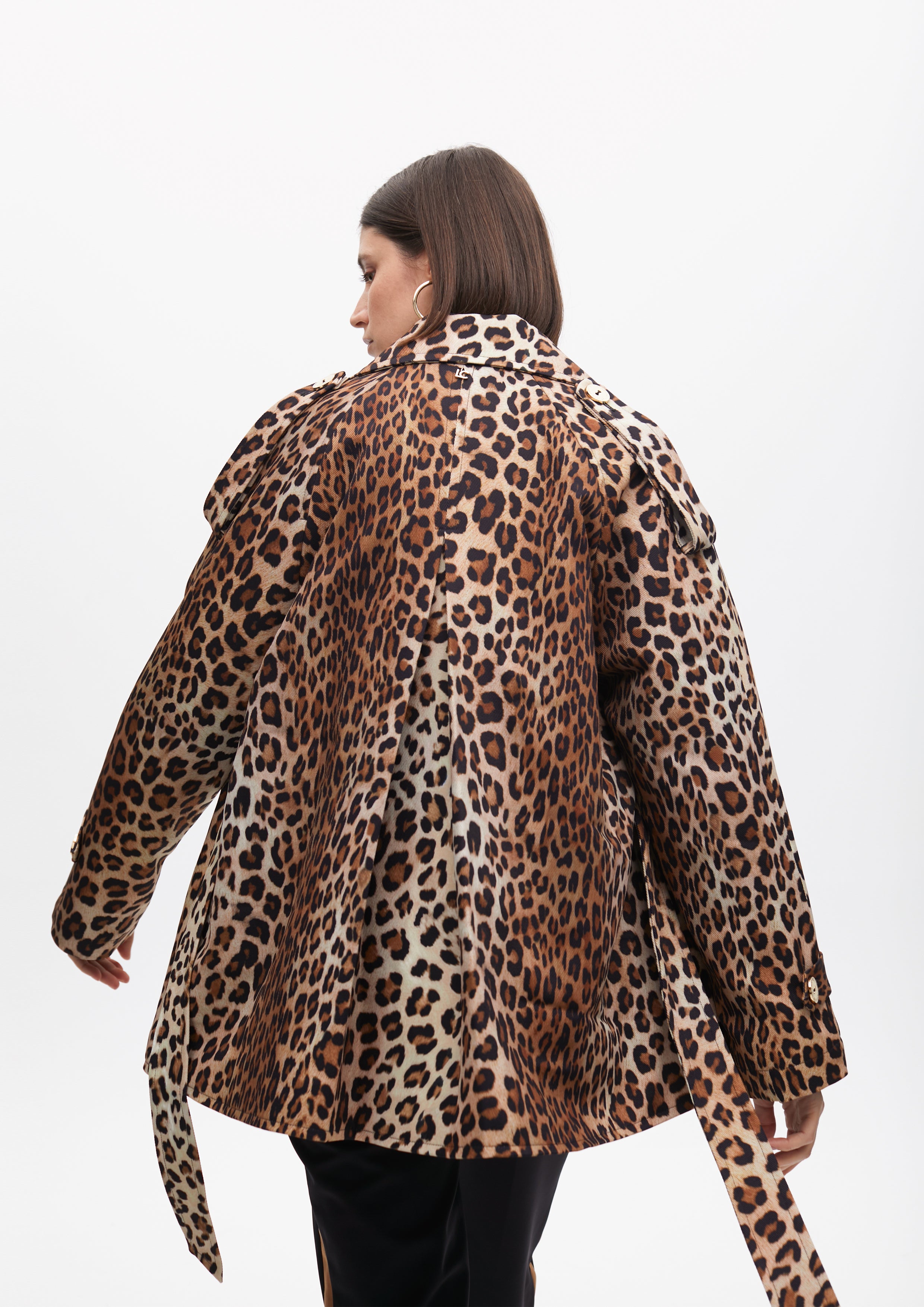 Trench curto com estampa de animal print e cinto ajustável. Feito de tecido de alta qualidade, com fechamento de botões metálicos e lapelas largas. Mangas longas com detalhes de fivela. Design estruturado que complementa qualquer look com um toque audacioso e contemporâneo.