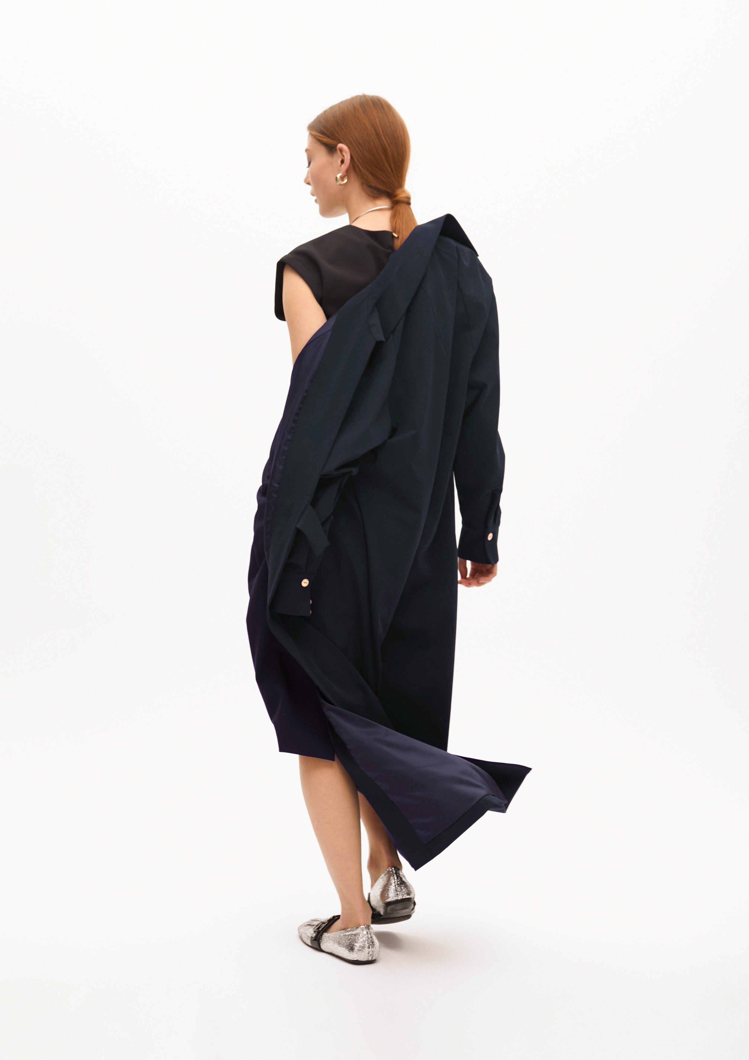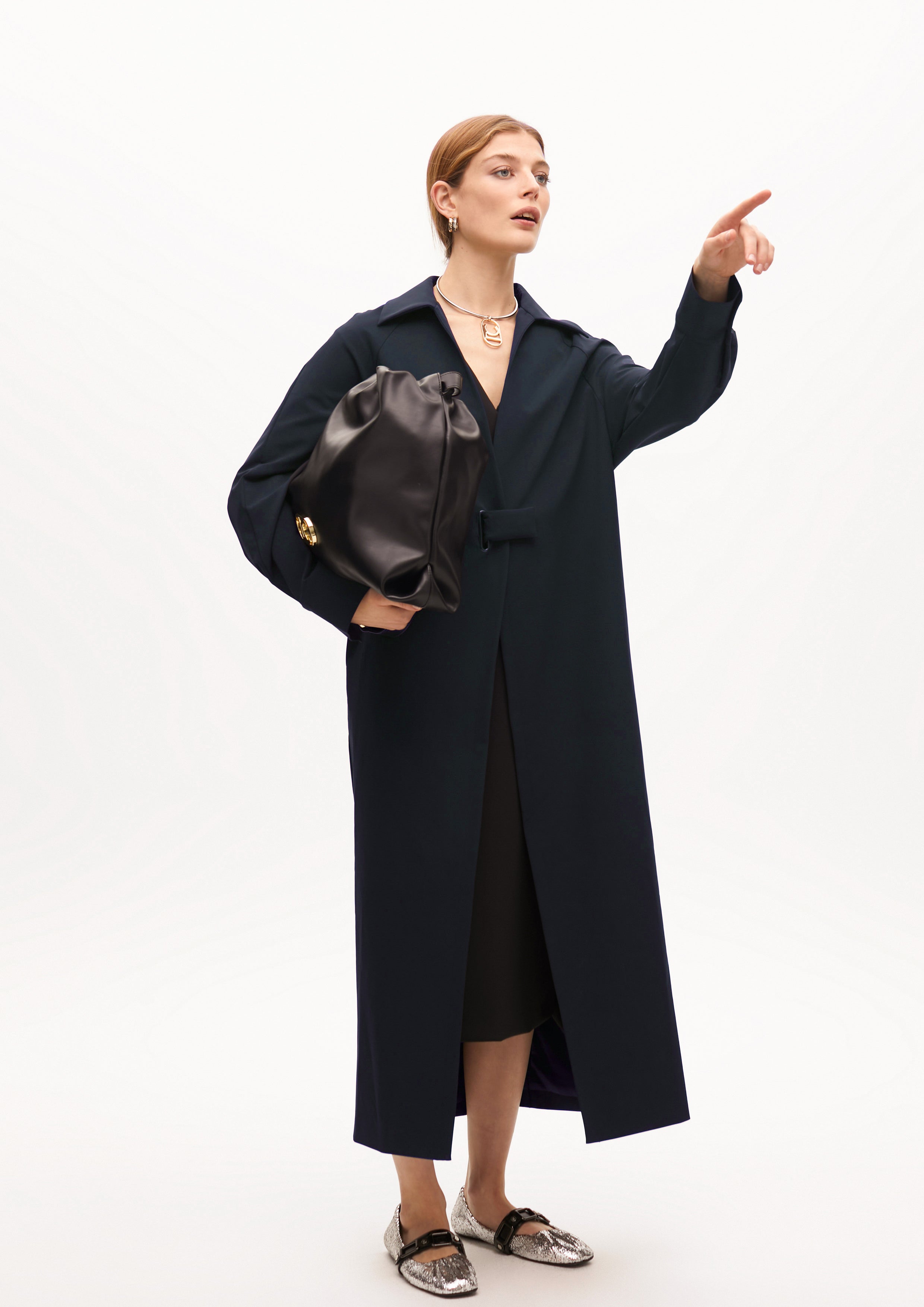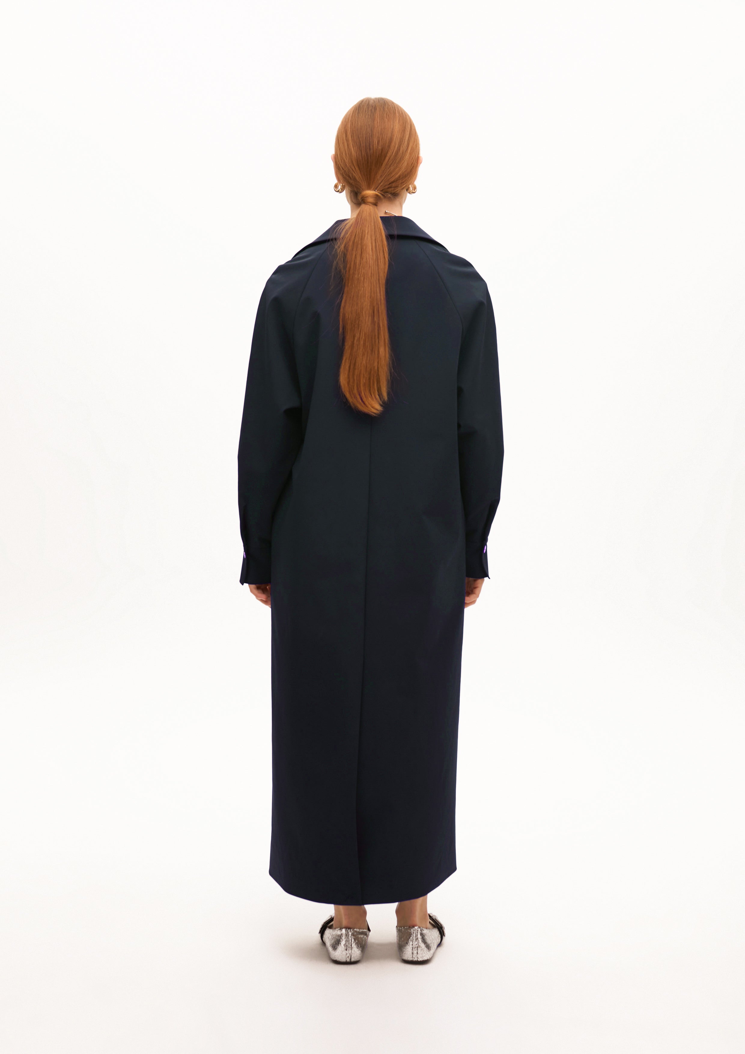 Trench longo confeccionado em tecido técnico de alta qualidade. Design minimalista com cinto ajustável para uma silhueta definida. Lapelas largas e corte reto. Perfeito para um visual sofisticado e funcional.