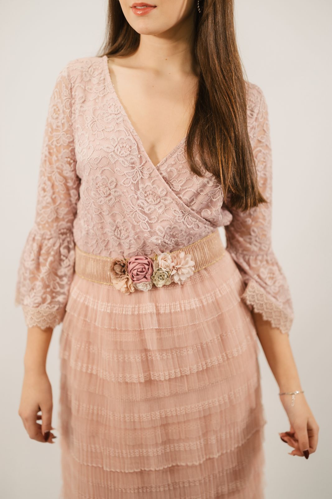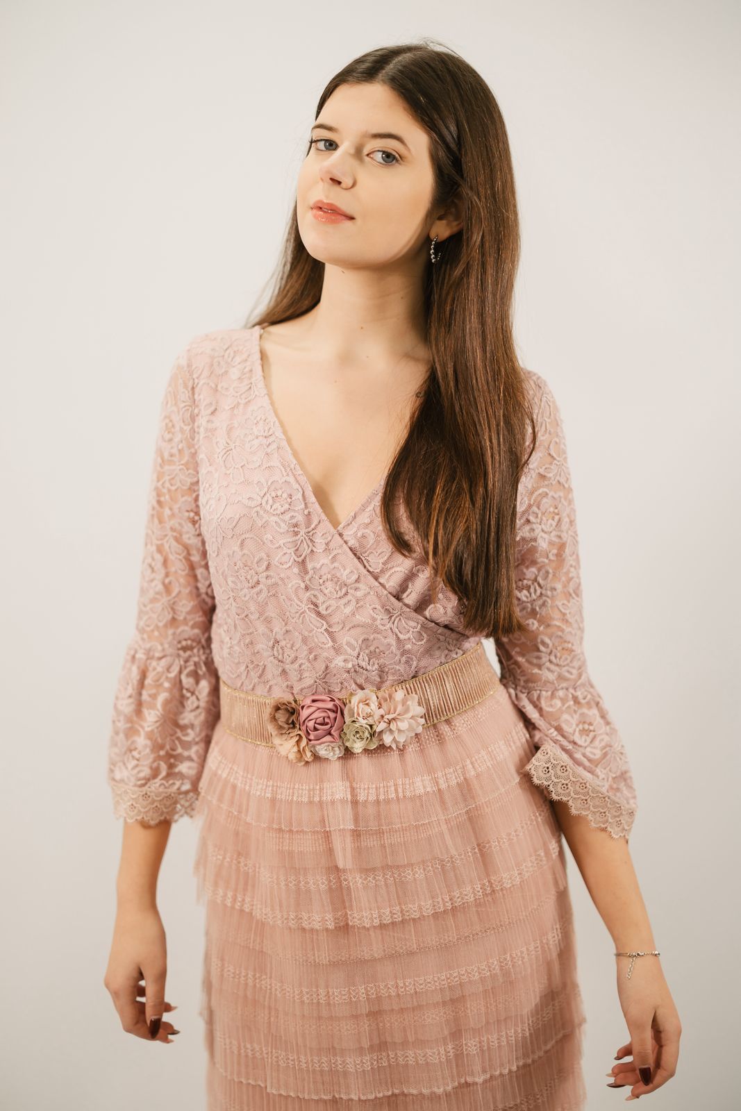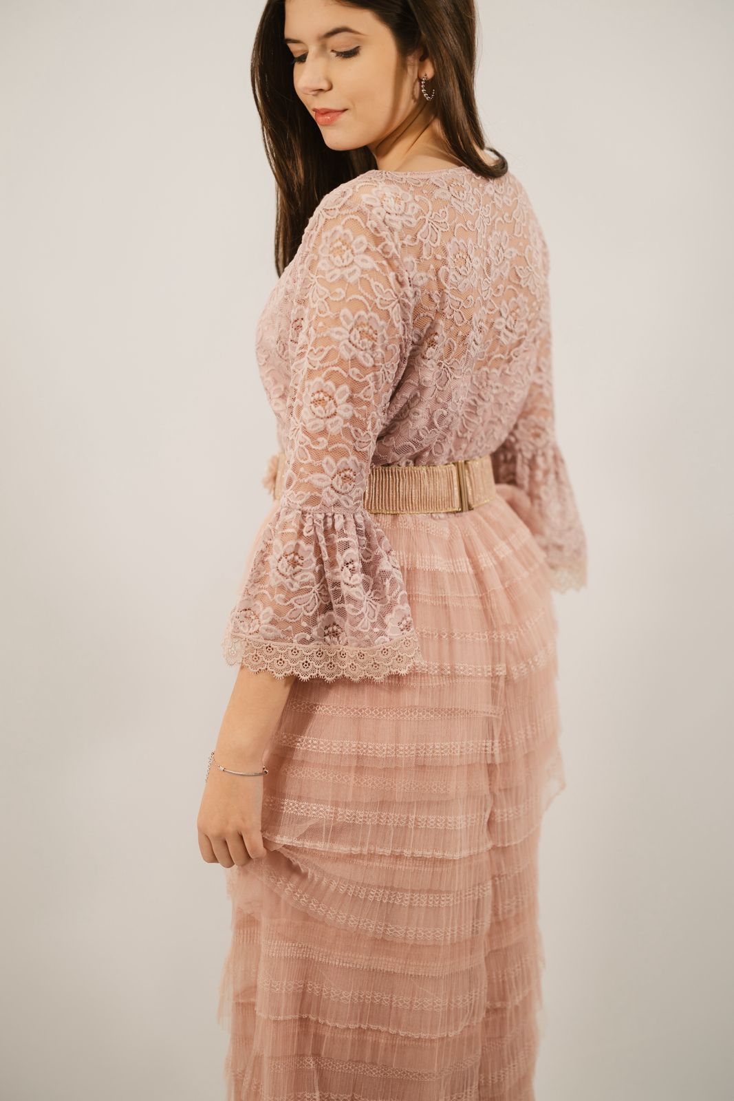 Com detalhes florais e renda, mangas delicadamente abertas e uma saia de tule que flutua com cada passo, este vestido rosa é puro encanto. Requintado, feminino e perfeito para ocasiões especiais.