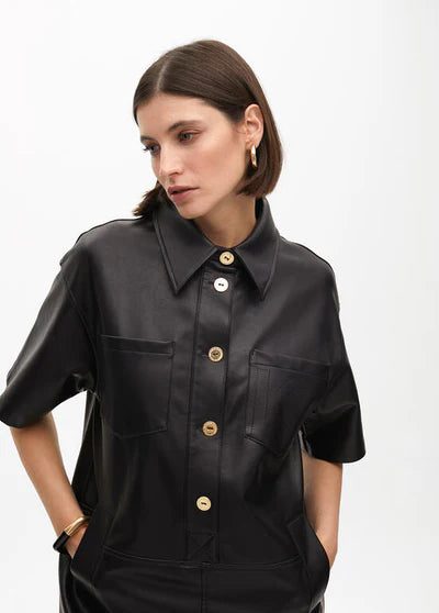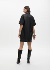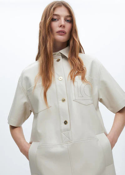 Vestido oversize midi em eco pele. Apresenta abotoamento central e dois bolsos na zona do peito.