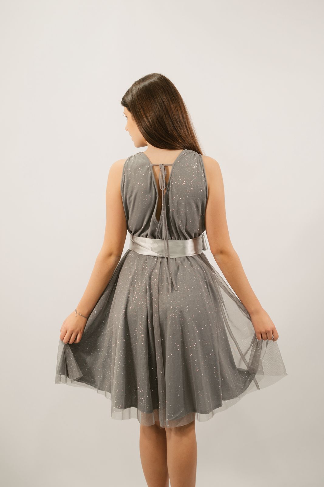 Um vestido de princesa cheio de brilhos que exala requinte, mas nunca deixa de ser o centro das atenções. O detalhe do cinto com laço é o charme final para um look que combina sofisticação e personalidade.